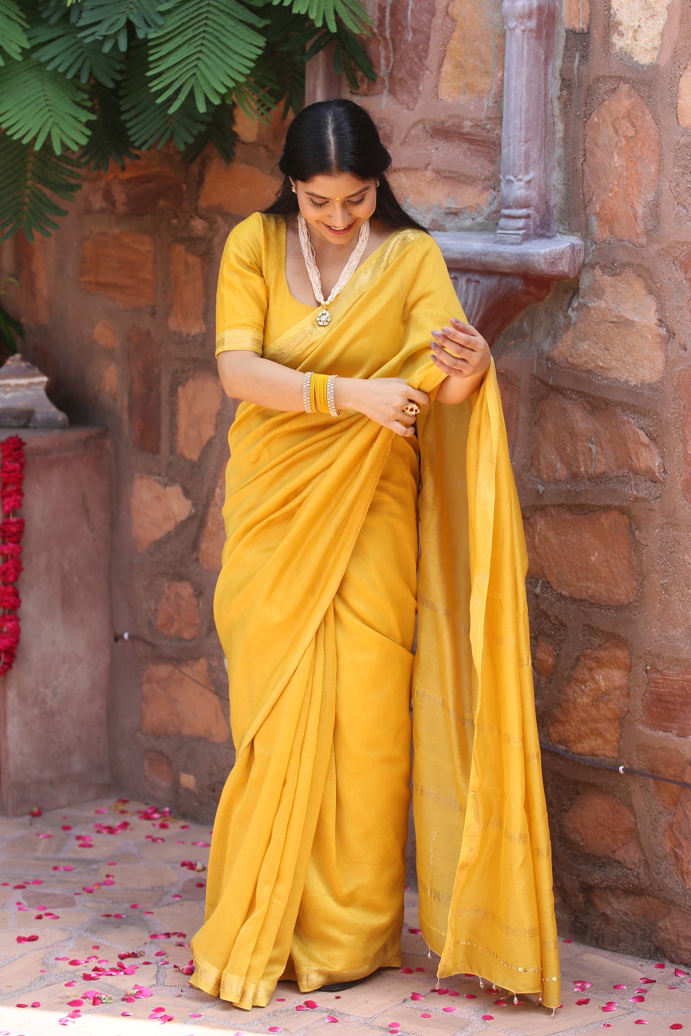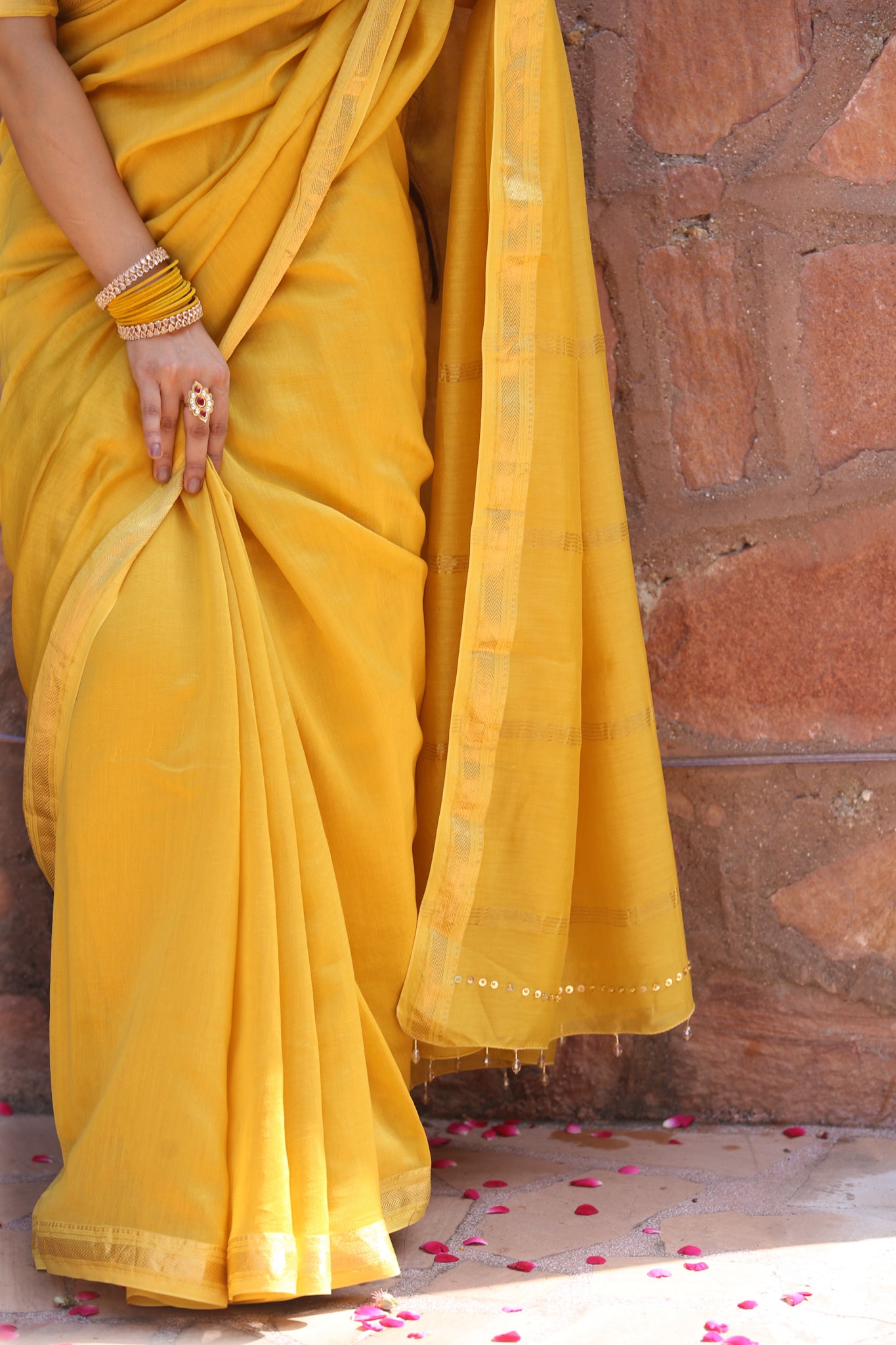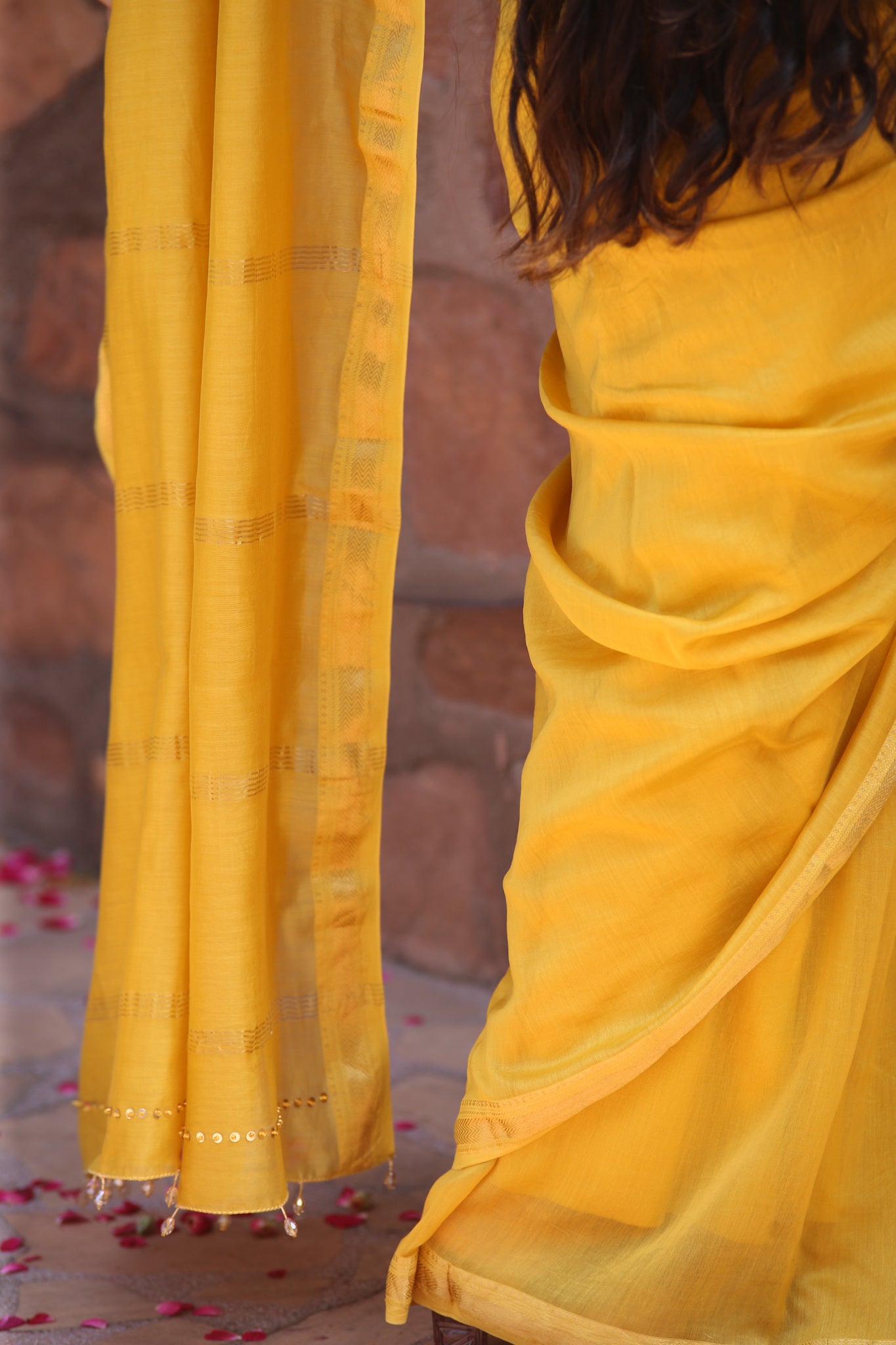 Bright and radiant like the first light of harvest, this golden yellow Maheshwari silk cotton saree glows with joy. Finished with zari borders and handcrafted tassels, it is perfect for haldi, festive rituals, and wedding ceremonies.