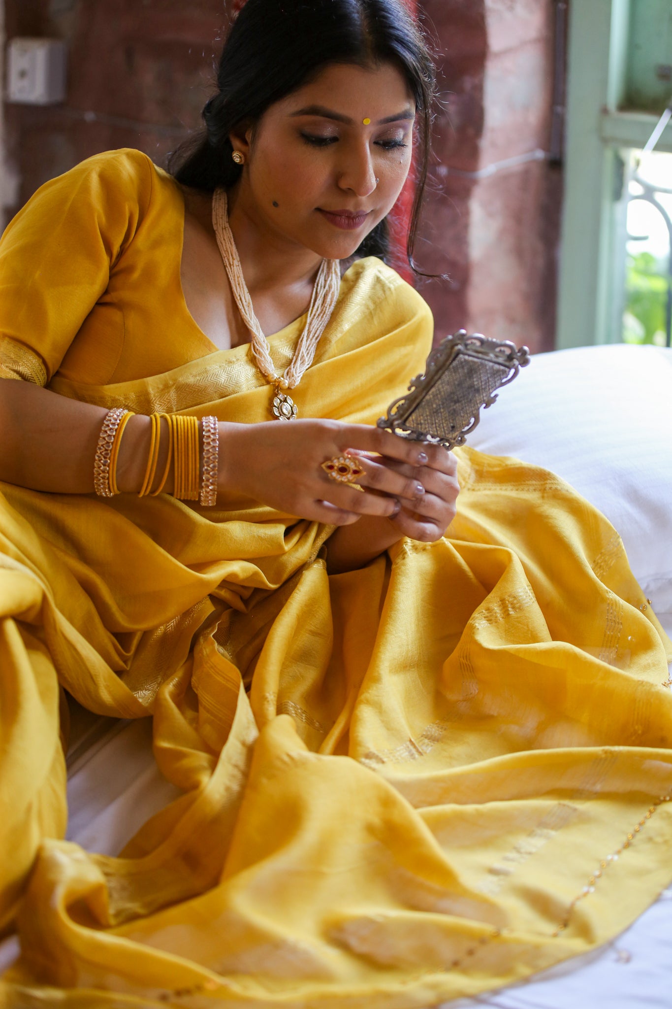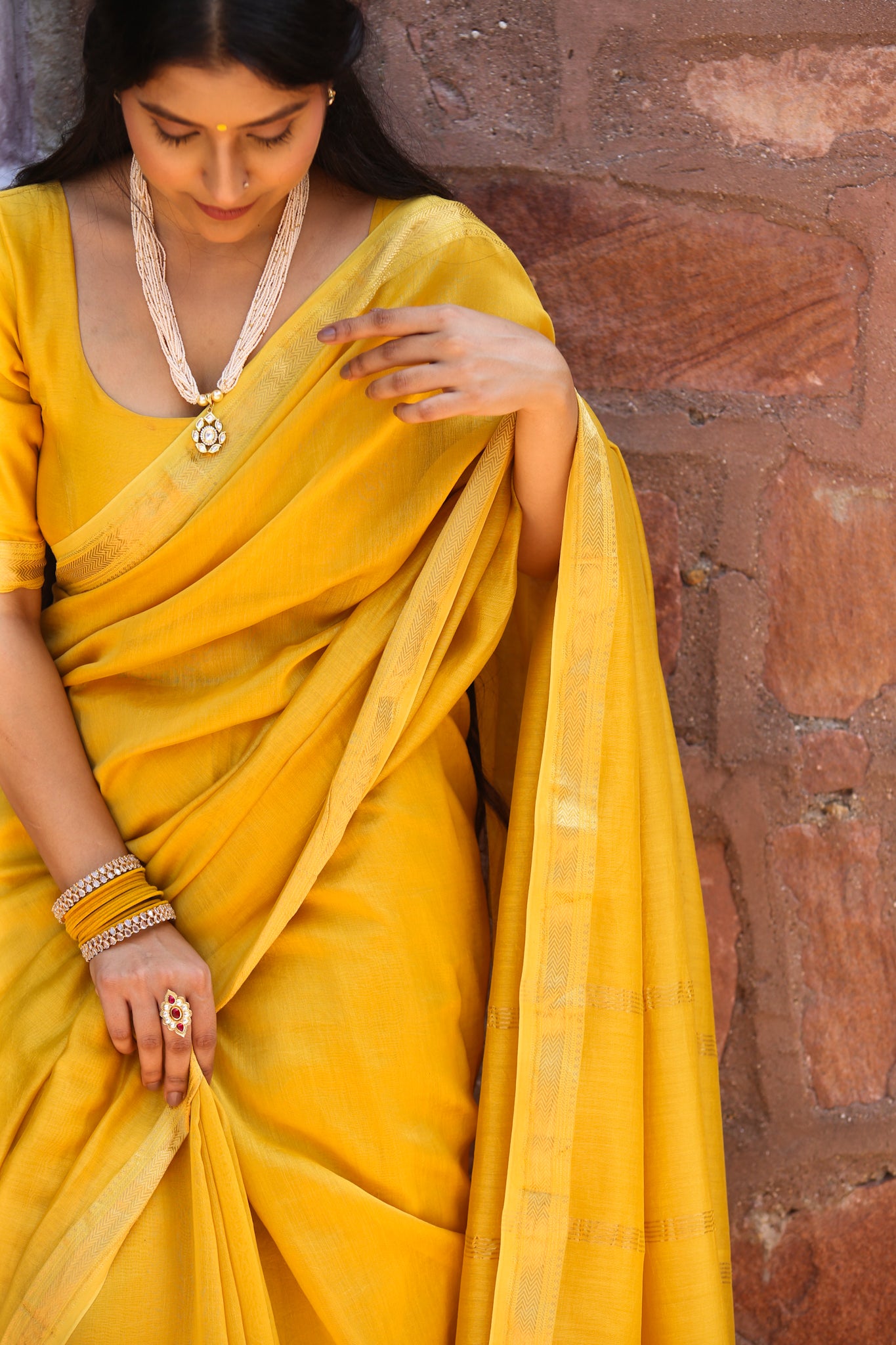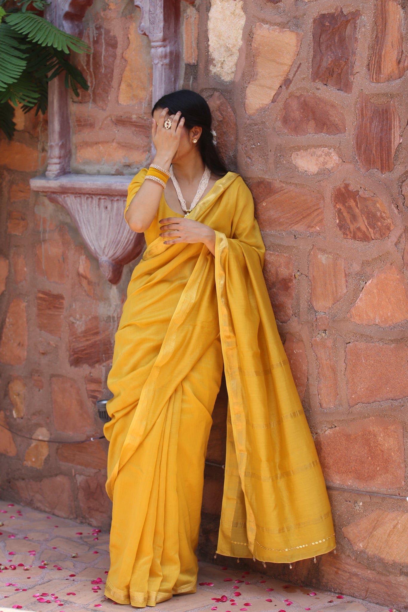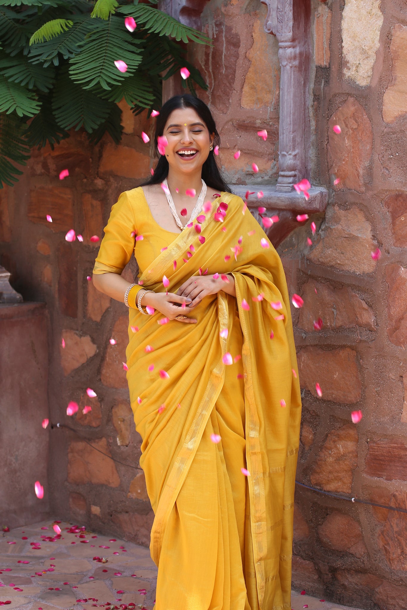 Bright and radiant like the first light of harvest, this golden yellow Maheshwari silk cotton saree glows with joy. Finished with zari borders and handcrafted tassels, it is perfect for haldi, festive rituals, and wedding ceremonies.