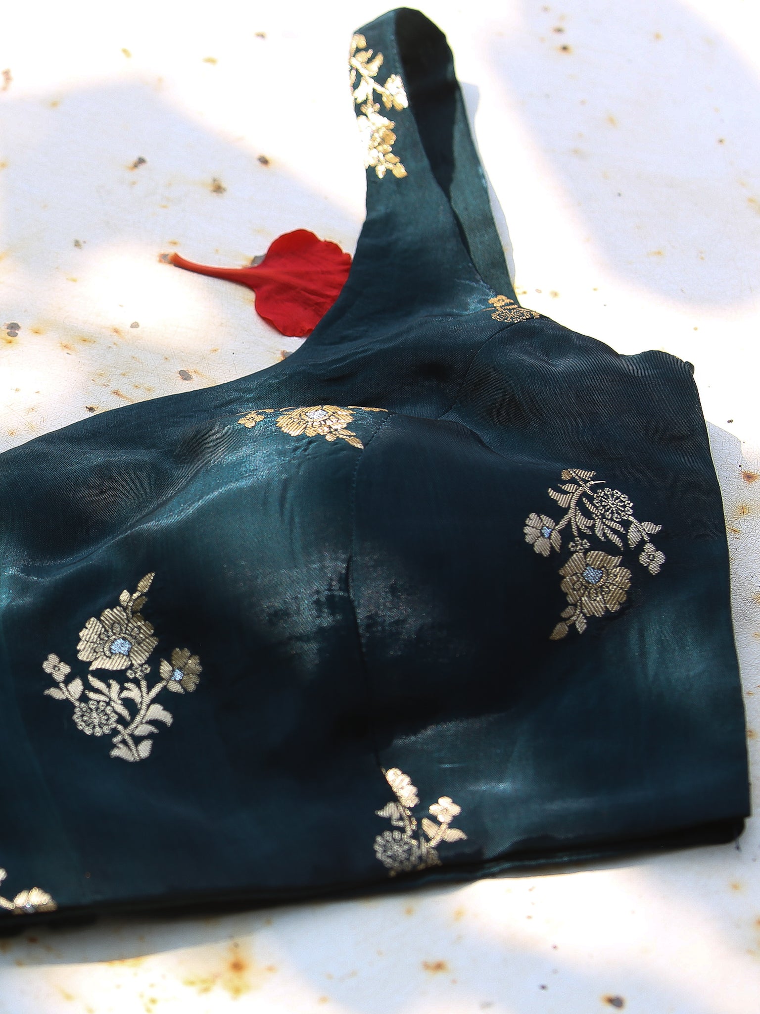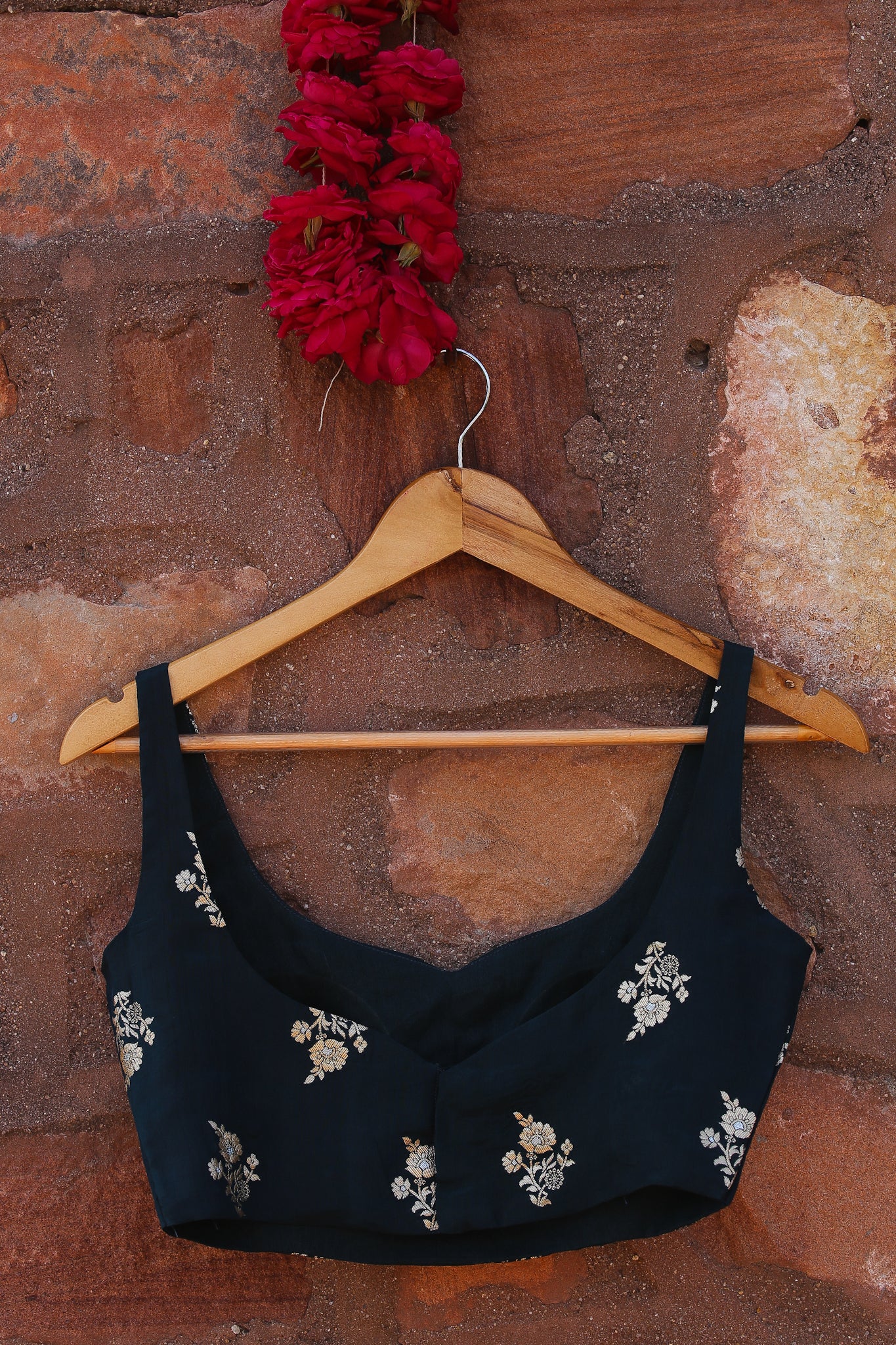 Crafted from pure Banarasi silk handloom fabric, this Dark Blue Colored sleeveless blouse blends traditional luxury with everyday comfort. It comes with padded cups, a back hook closure, and dual lining layers, including a soft pure cotton inner lining that keeps it comfortable and breathable all day long.