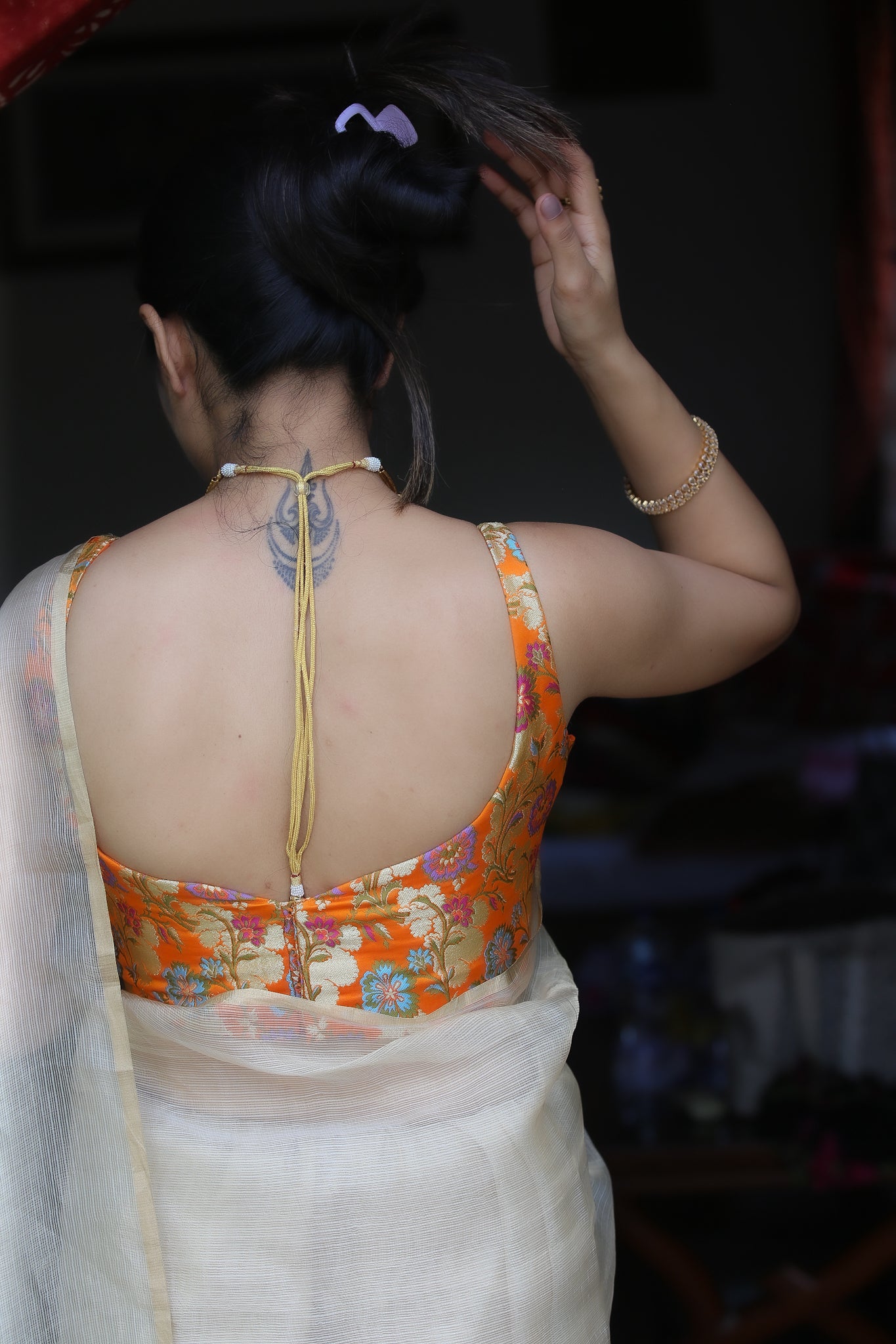 Crafted from pure Banarasi satin silk fabric, this Bright Orange Colored sleeveless blouse blends traditional luxury with everyday comfort. It comes with padded cups, a back hook closure, and dual lining layers, including a soft pure cotton inner lining that keeps it comfortable and breathable all day long.