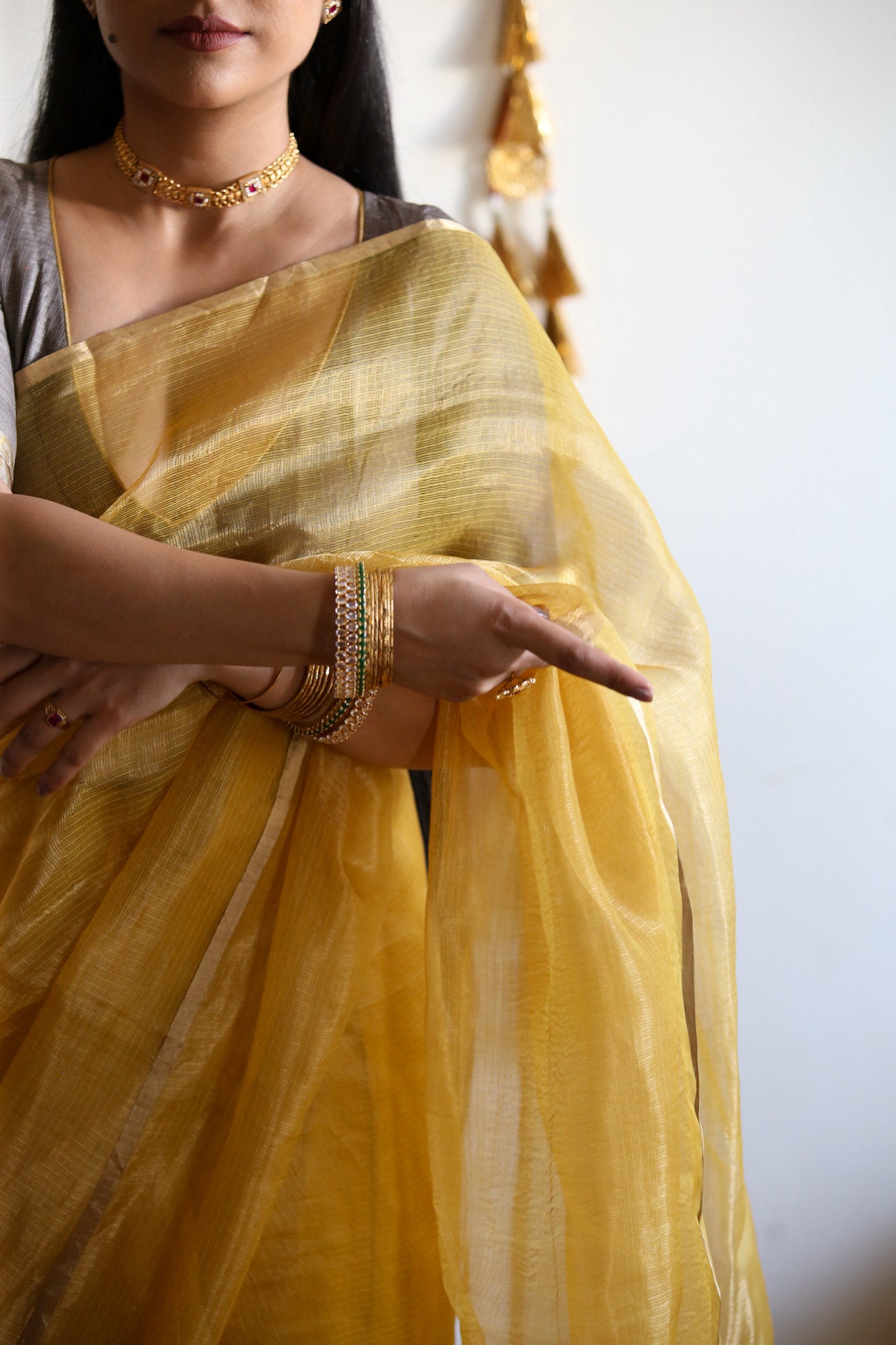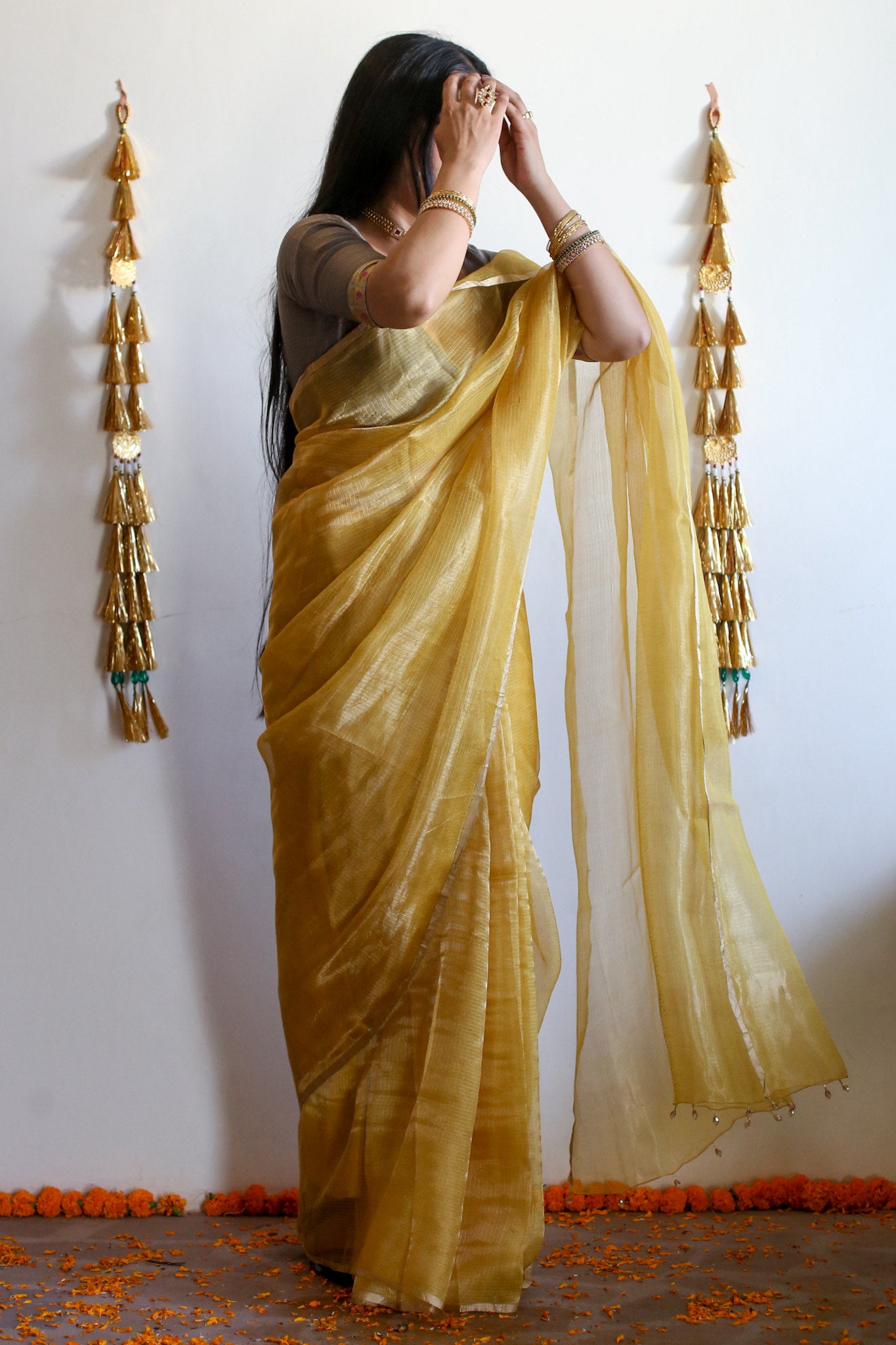 Radiant and refined, this yellow saree in handloom Kota Doria silk by gold tissue silk brings a sunshine glow to any occasion. With a feather-light feel and shimmering golden dual-tone finish, it’s ideal for celebrations or summer weddings. Comes with a coordinated yellow blouse, zari border, and handmade tassels.