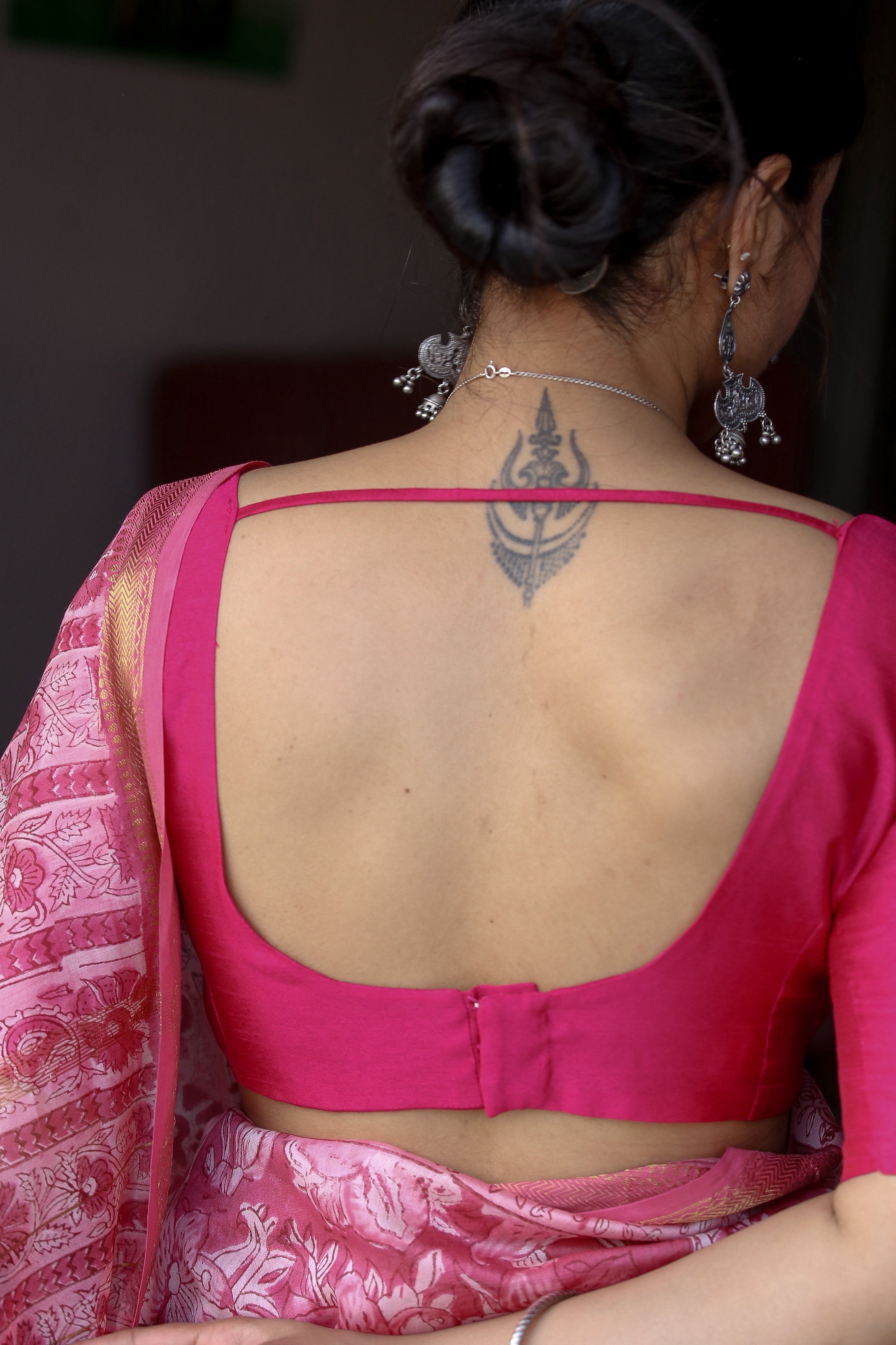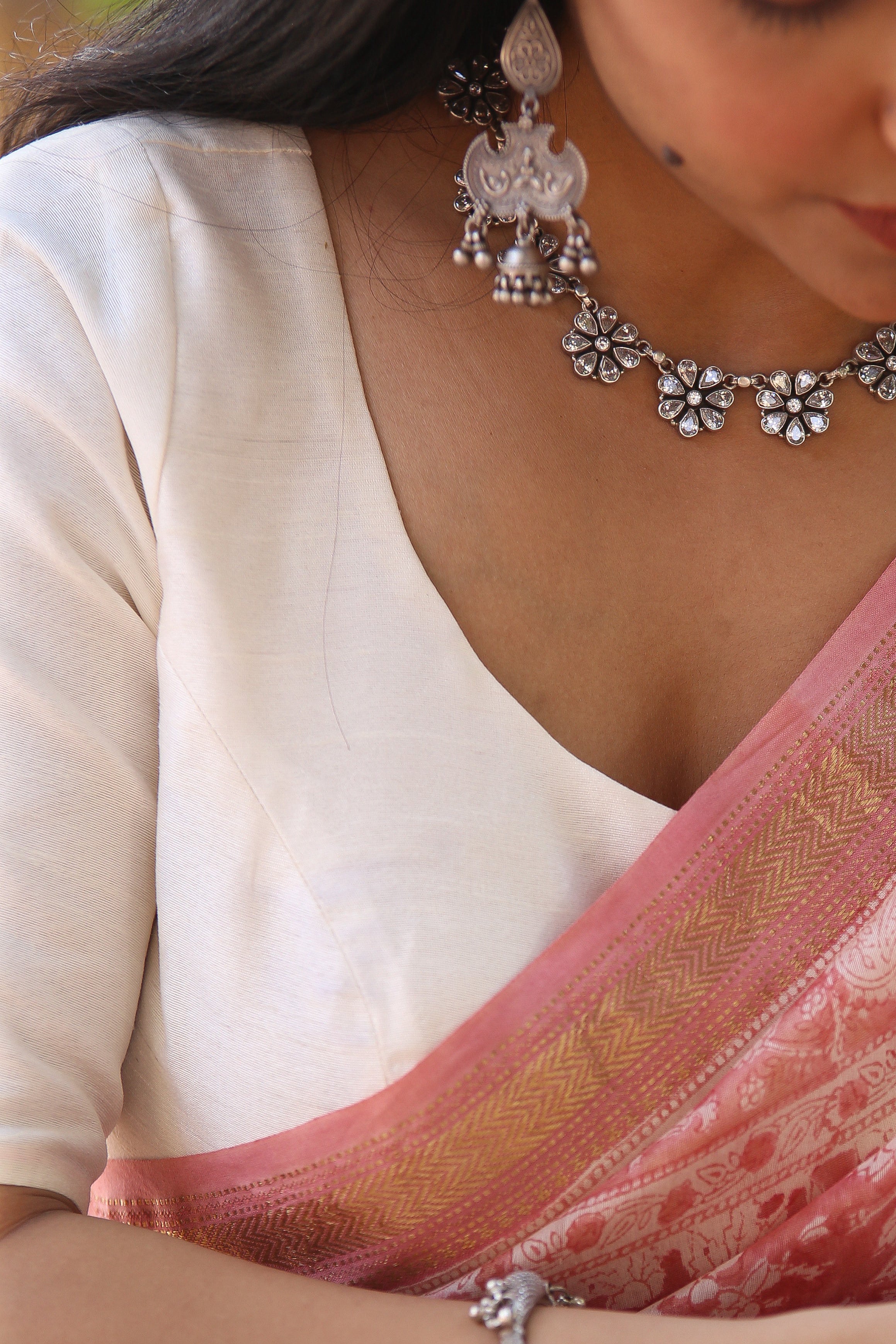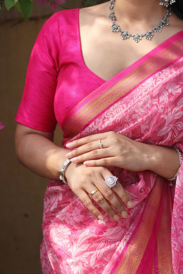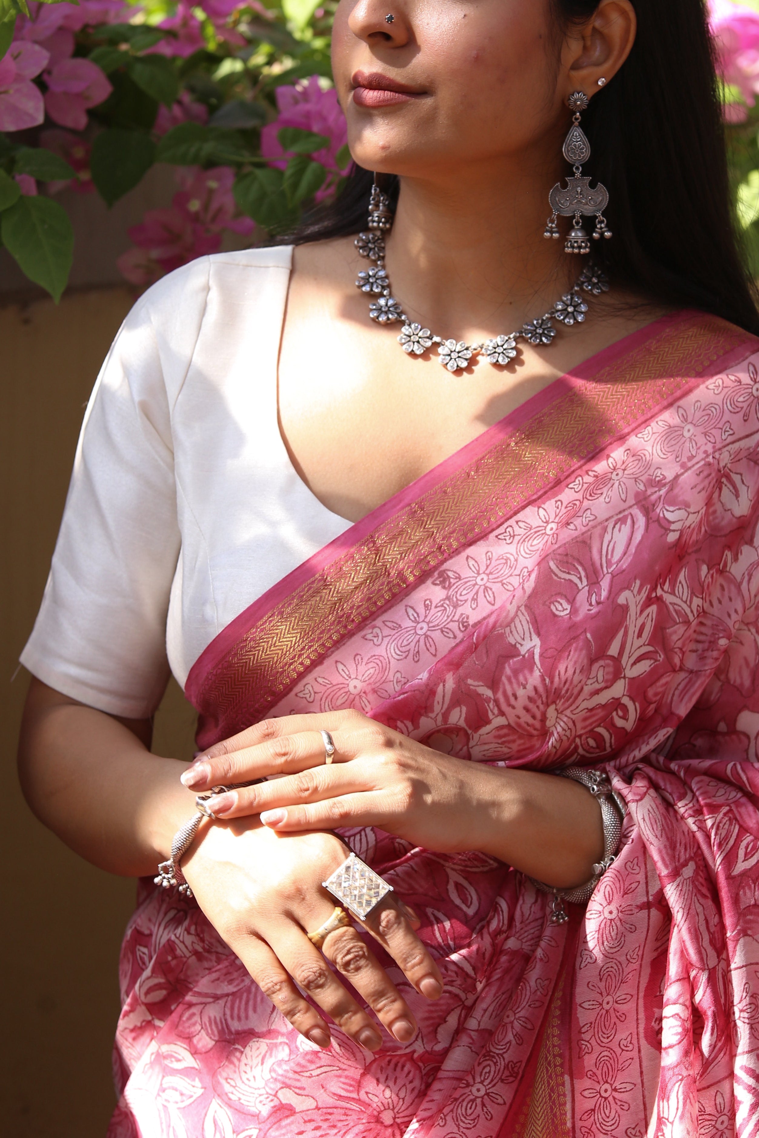 This beautiful summery chiffon saree with pretty pink flowers gives such a soothing and flowy feel. Love how it falls without any extra efforts. All thanks to Gray and Green store for the beauty.