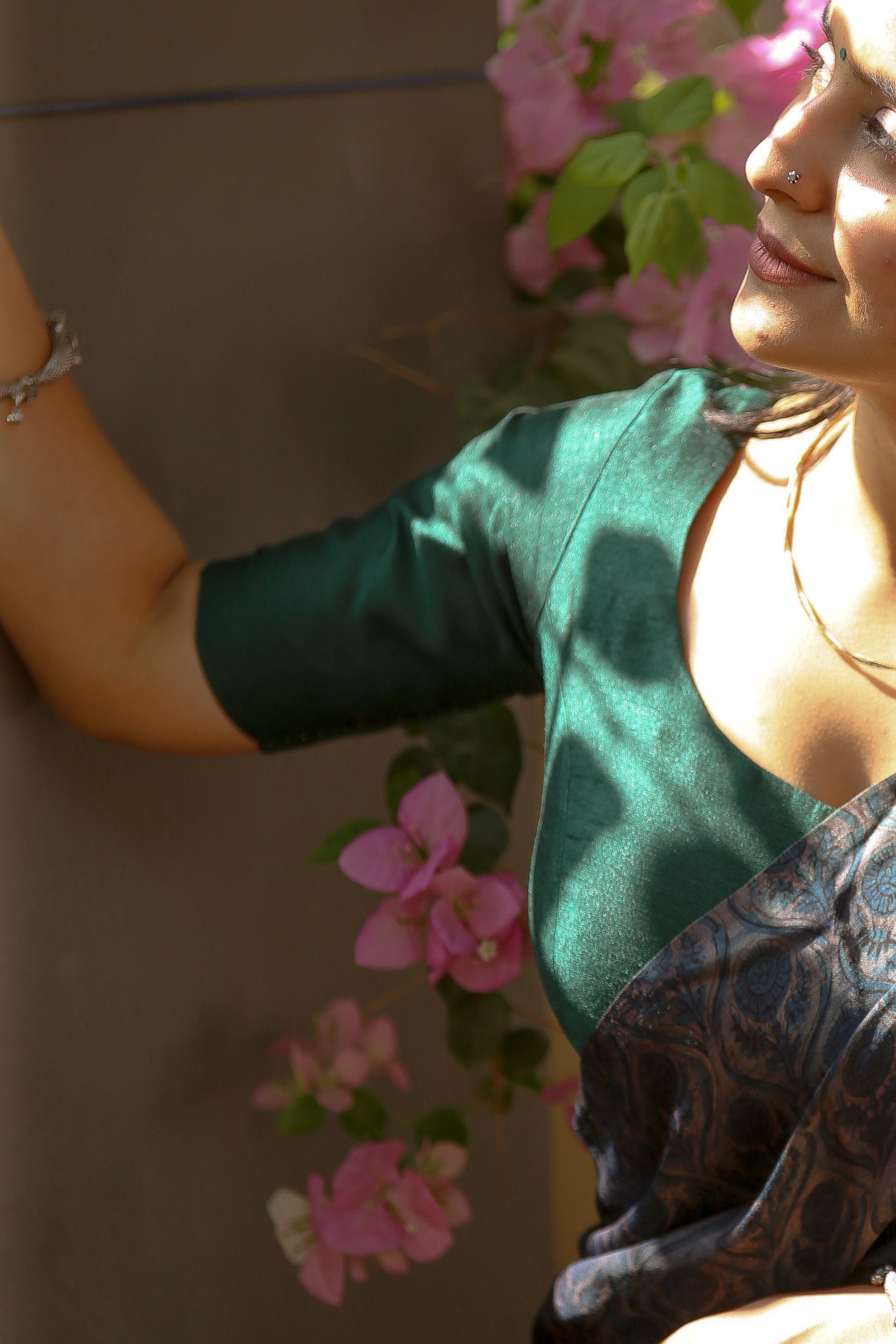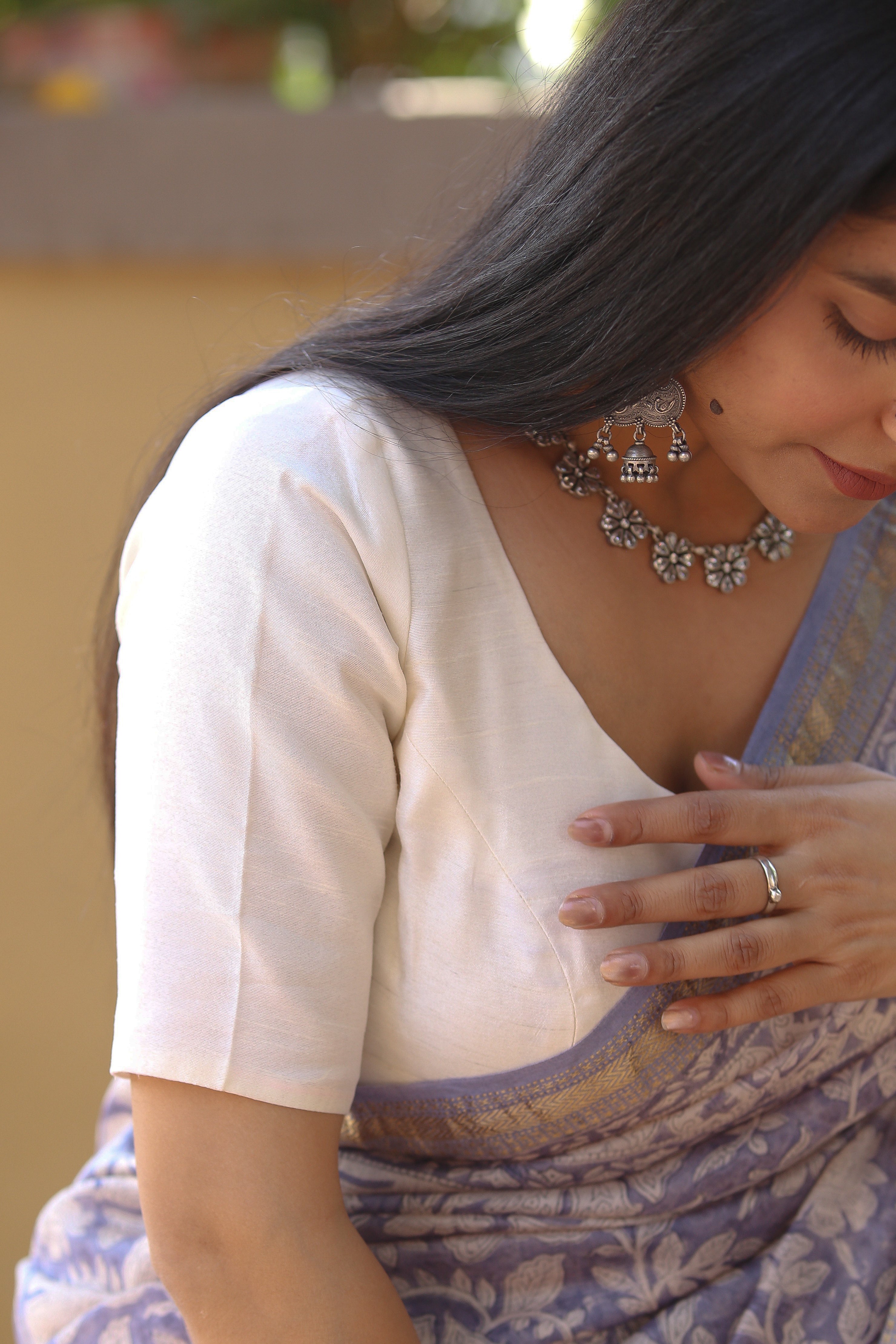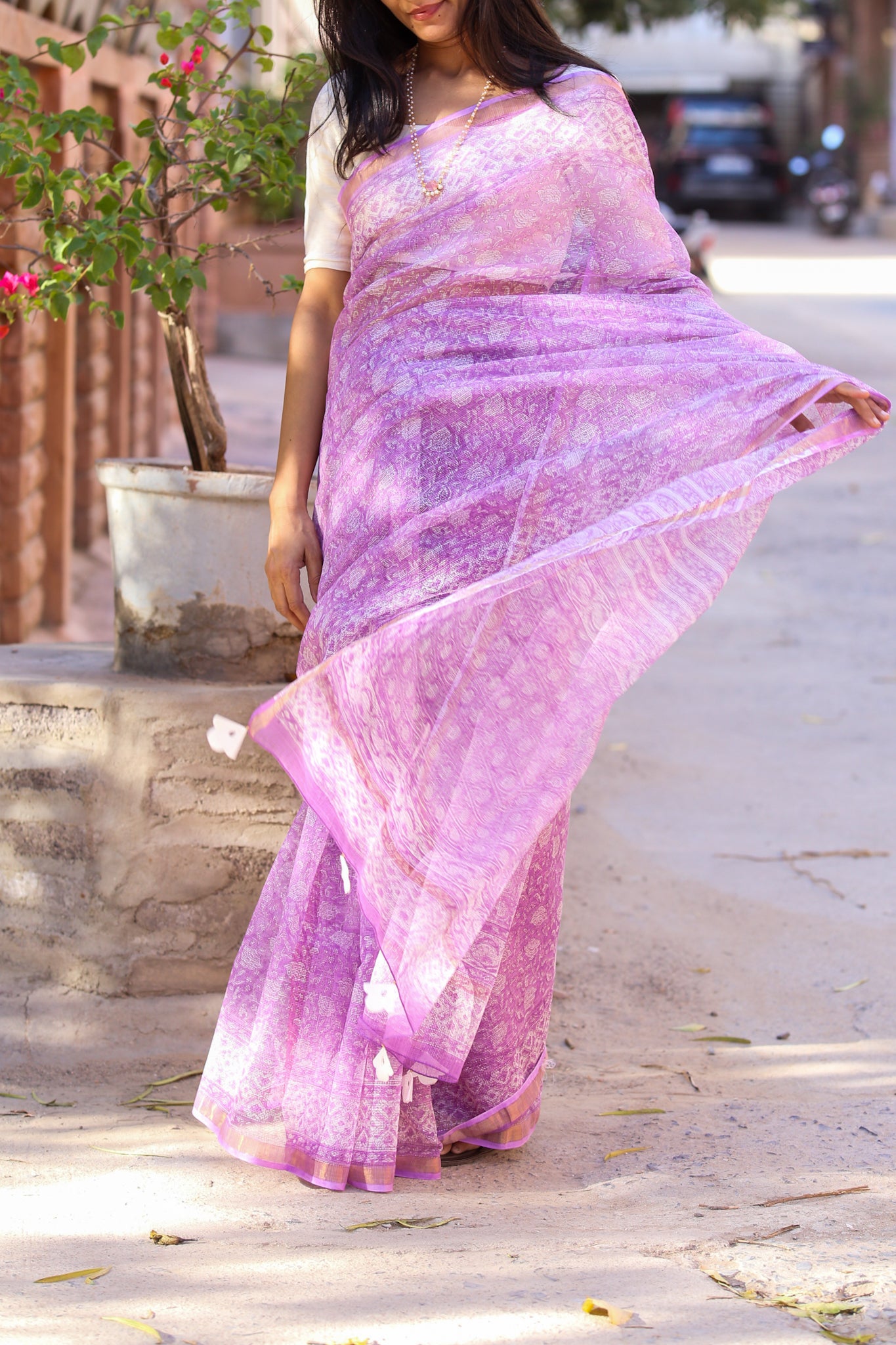 This beautiful summery chiffon saree with pretty pink flowers gives such a soothing and flowy feel. Love how it falls without any extra efforts. All thanks to Gray and Green store for the beauty.