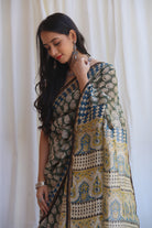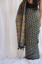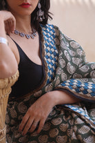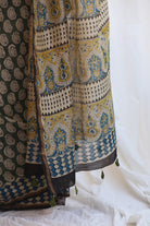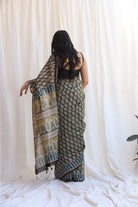 A sophisticated olive green Chanderi saree featuring intricate black Bagru handblock-printed bootis and a striking blue geometric border. Lightweight and elegant, this saree blends heritage craftsmanship with contemporary appeal, making it perfect for festive and formal occasions.