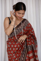 Rich madder red and black tones define this classic Bagru handblock printed Chanderi silk cotton saree. With handcrafted tassels on the pallu, it’s perfect for cultural gatherings and elegant evenings. A timeless heritage piece with artistic soul.