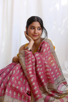 A delicate pink Chanderi saree, beautifully adorned with traditional ambi (paisley) Bagru handblock prints and contrasted with a bright yellow border. The luxurious texture and lightweight feel make it an ideal pick for festive occasions and elegant daywear.