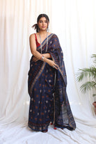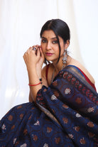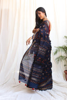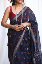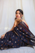 Inspired by vintage aesthetics, this saree carries an old-world charm with its authentic Bagru handblock prints. Set on a deep indigo base, the traditional motifs narrate a story of craftsmanship, making it an exquisite addition to your saree collection.