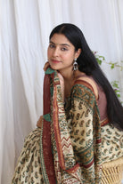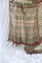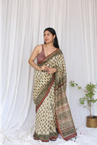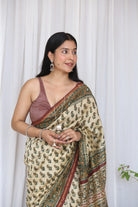 This light and graceful ivory Chanderi saree features intricate Bagru handblock ambi bootis, offering a soft and timeless look with a handcrafted finish.