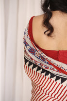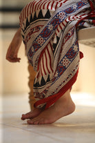 A rich fusion of Bagru and Ajrakh handblock traditions comes alive on modal silk in madder, black, and indigo hues. Striped and patterned with timeless motifs, this saree feels rooted yet free-spirited. With handmade tassels on the pallu, it's fluid, bold, and steeped in earthy artistry.