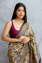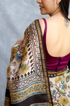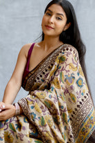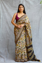 This classic Kalamkari block print Chanderi Saree is crafted from Chanderi silk cot with a zari border fabric. It features beautiful hand block printing border, handmade tassels on the pallu, and handcrafted with Block print art. The saree is 5.5 meters by Length and 44'' inches by Height with an 80-90 cm block print blouse. Dry Clean only.
