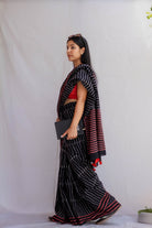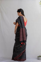 Indulge in the artistry of this handcrafted, azo free dyed saree, featuring a sophisticated Black Red Lining Bagru Print Saree. The matching block print blouse adds an element of authenticity to this soft, formal ensemble. Embody contemporary elegance with this Modernity-inspired piece. For best results, handwash with mild liquid detergent. A must-have for any stylish wardrobe, it's suitable for all occasions.