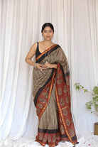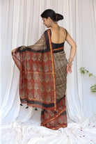 Featuring a Mughal-inspired madder border and bold black stripes, this Chanderi silk cotton saree stands out with its detailed Bagru handblock work. Tassels add a handmade finish. A regal choice for traditional functions.