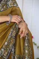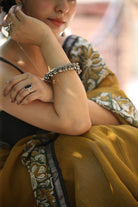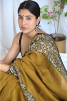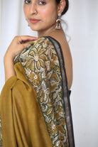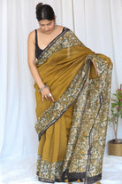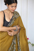 A luxurious blend of Chanderi silk by cotton, this saree features a rich dark mustard base with elegant Bagru handblock prints, enhanced by an olive and black contrast border and handmade tassels.