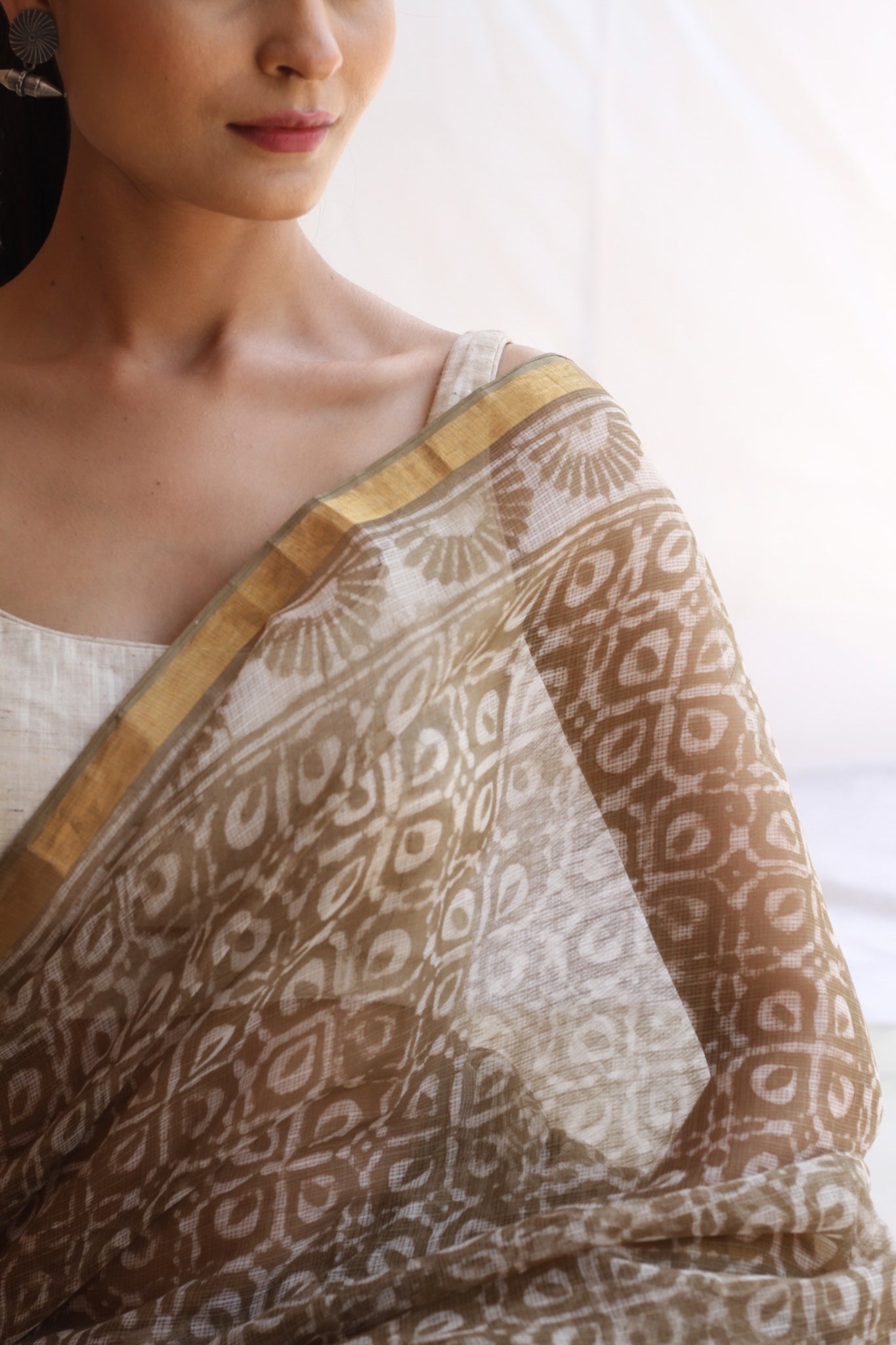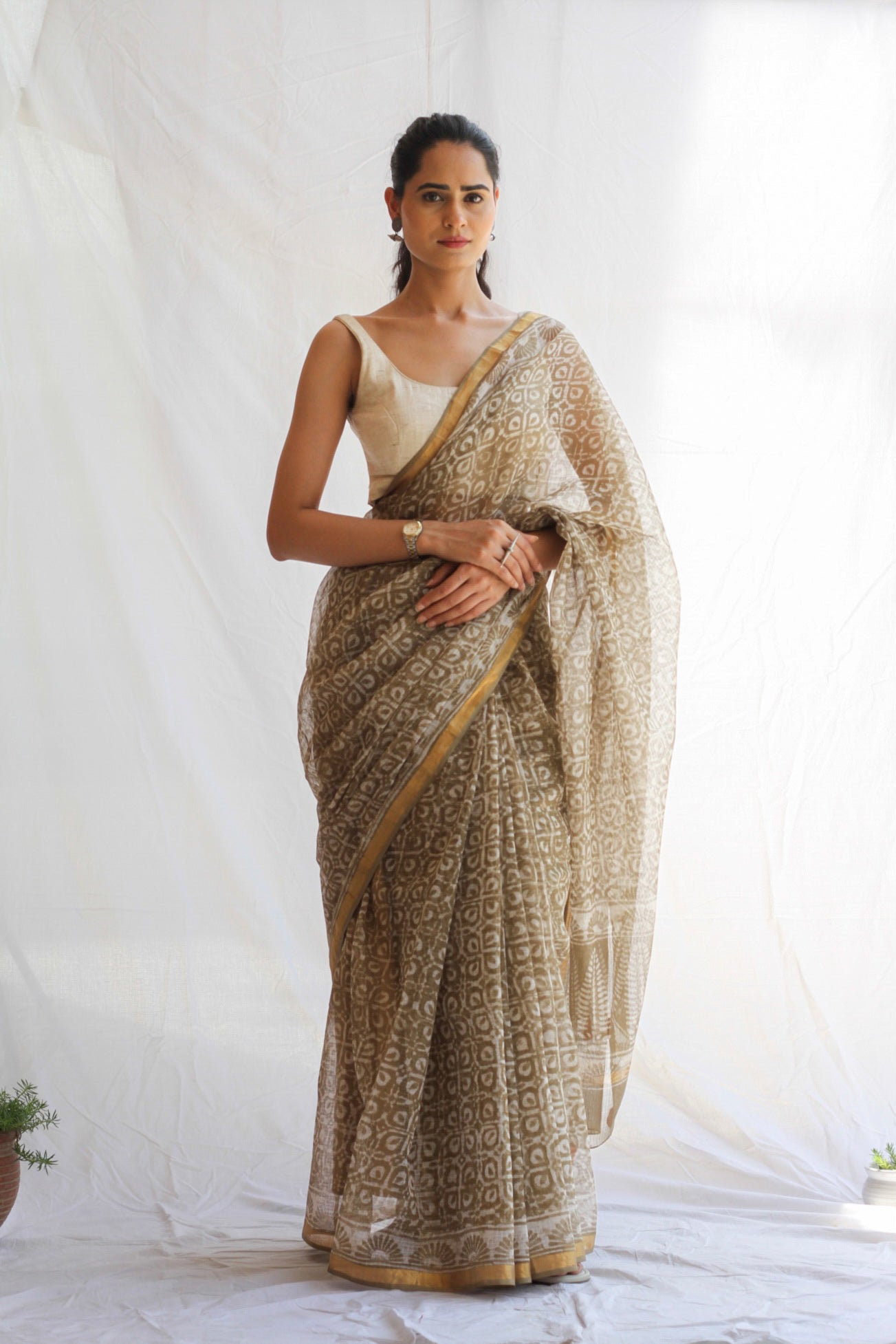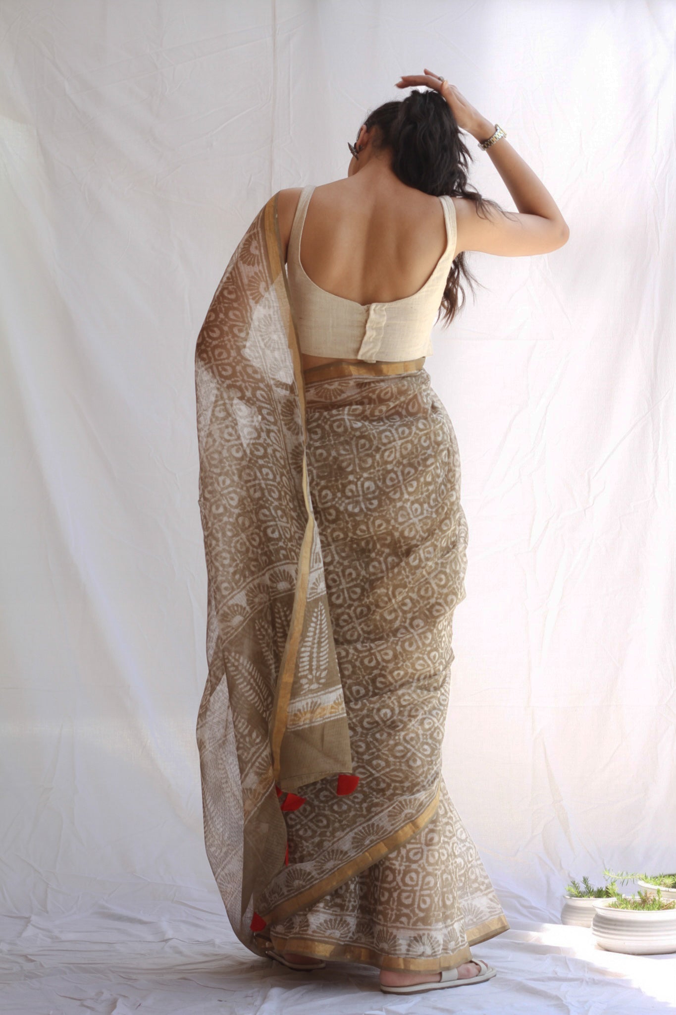 Indulge in the timeless elegance of the handcrafted Kashish Pipar Dabu Kota Doria Saree, featuring exquisite block print designs and natural dyes. Complete your ensemble with the matching block print blouse, adding a touch of sophistication to your look.