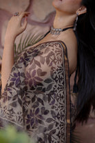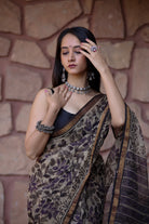 This saree exudes understated elegance, with a soft cream base adorned in intricate charcoal black handblock prints. Crafted from lightweight cotton Kota Doria, it features a delicate zari border, adding a touch of shimmer to the natural fabric. The saree comes with a matching 80-90 cm handblock printed blouse piece and is finished with beautifully handmade tassels on the pallu, perfect for a classic yet contemporary look.