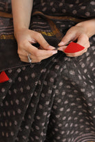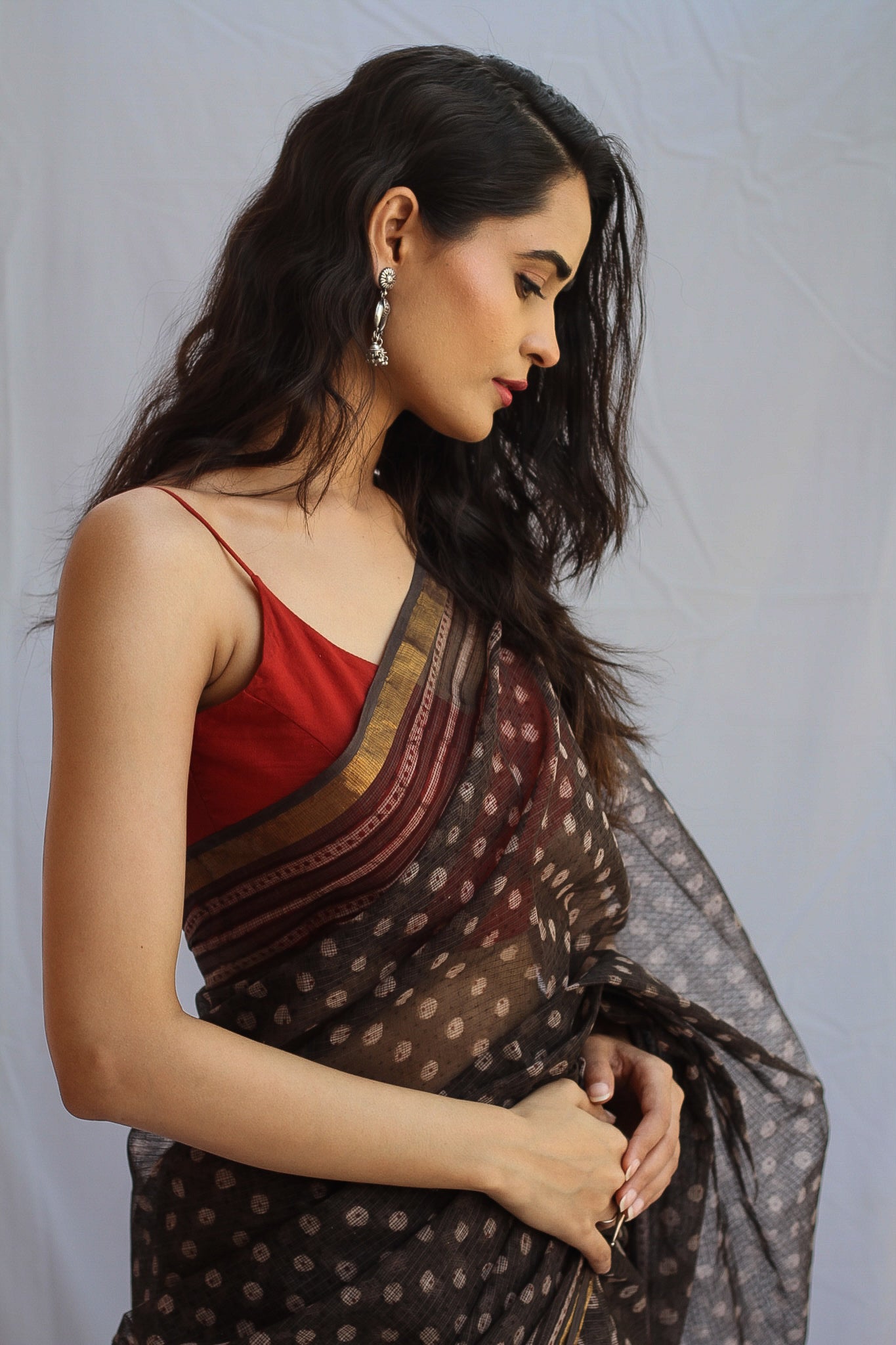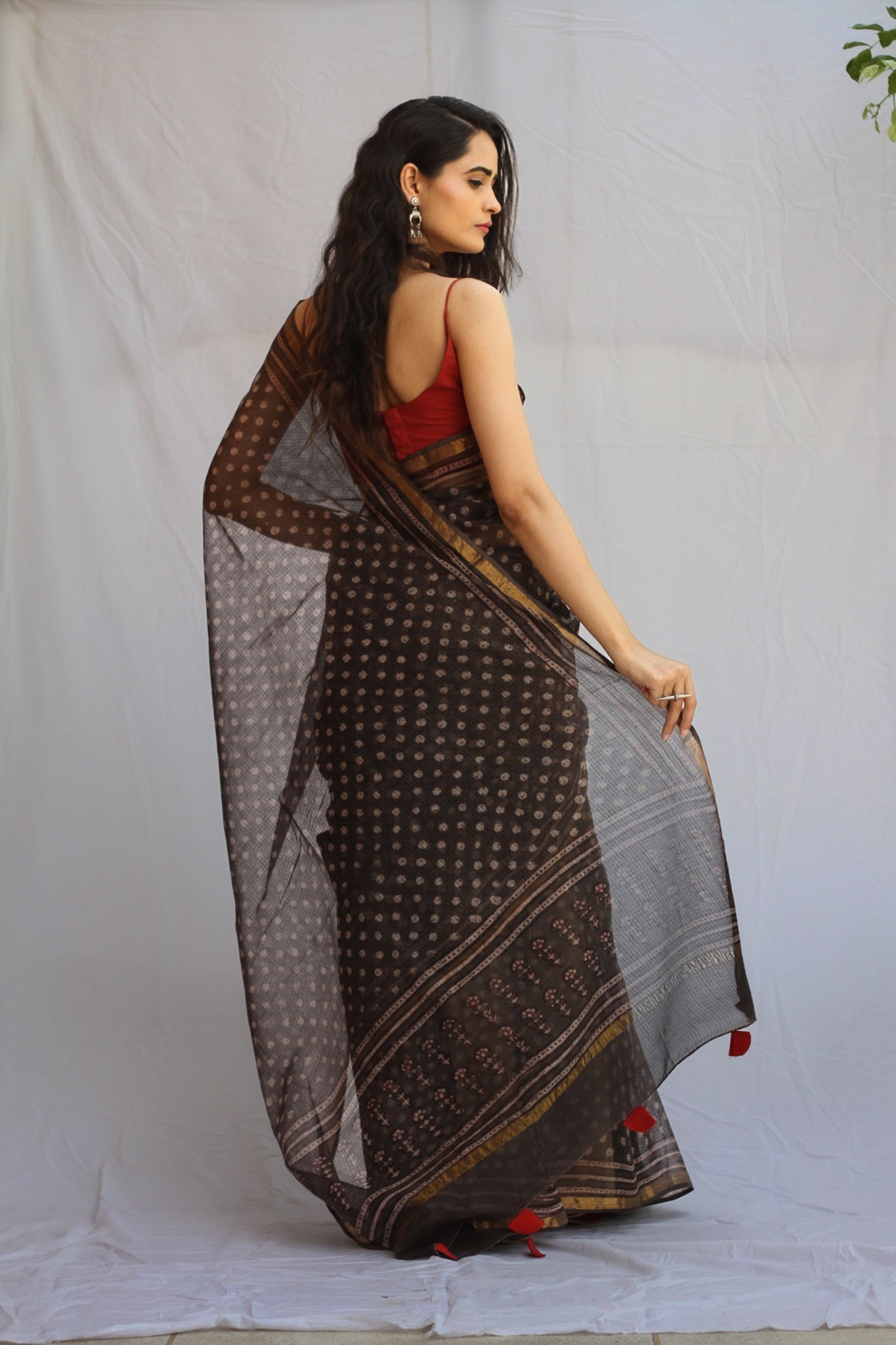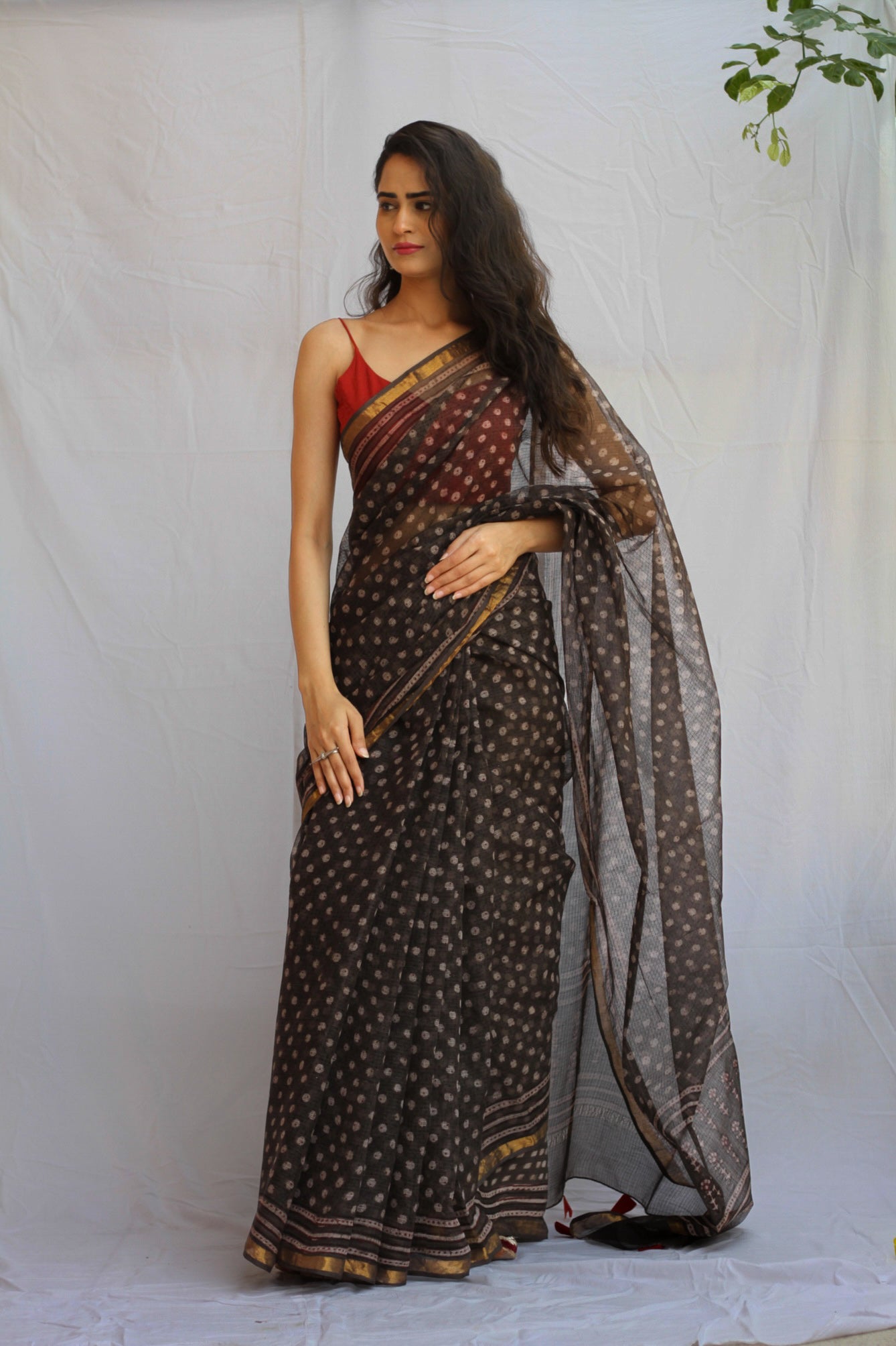 Discover the elevated elegance of Gulzar: Kashish Polka Pipar Dabu Kota Doria Saree, adorned with artisanal block prints and made from natural dyes. Complement the ensemble with our matching block print blouse for a truly refined look.