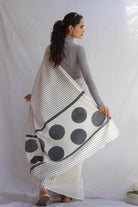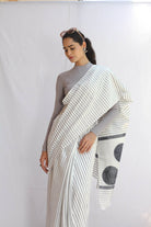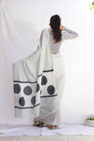 This exquisite "Varsha" saree boasts intricate handcrafted design, dyed using azo-free dyes for a luxurious and sustainable touch. The smart Lining print is adorned with a bold grey block print, making a statement of elegance and sophistication. Complimentary to the saree is a matching block print blouse, completing this high-end and exclusive ensemble.