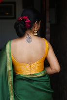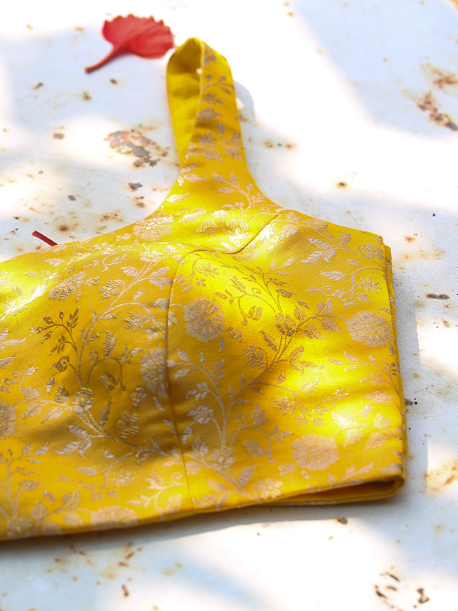 Crafted from pure Banarasi satin silk fabric, this Yellow Colored sleeveless blouse blends traditional luxury with everyday comfort. It comes with padded cups, a back hook closure, and dual lining layers, including a soft pure cotton inner lining that keeps it comfortable and breathable all day long.
