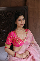 This bold rani pink blouse draws from Marwar’s gulabi spirit, where every celebration is wrapped in pink hues. Embellished with circular gota embroidery and fine zari detailing, it carries the essence of royal kanchlis once paired with lehengas. Now reimagined for sarees, it brings regal charm to festive and wedding drapes.