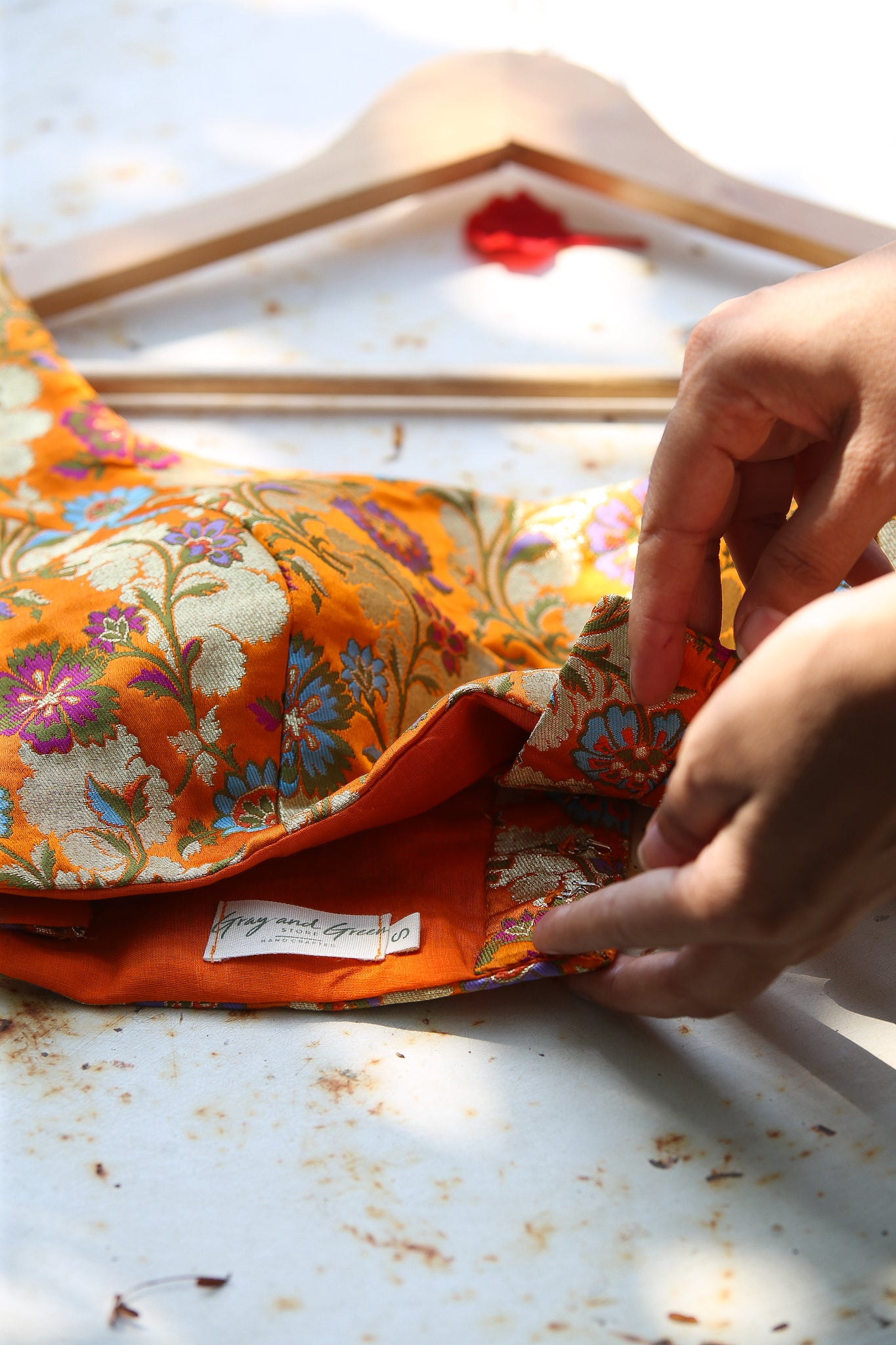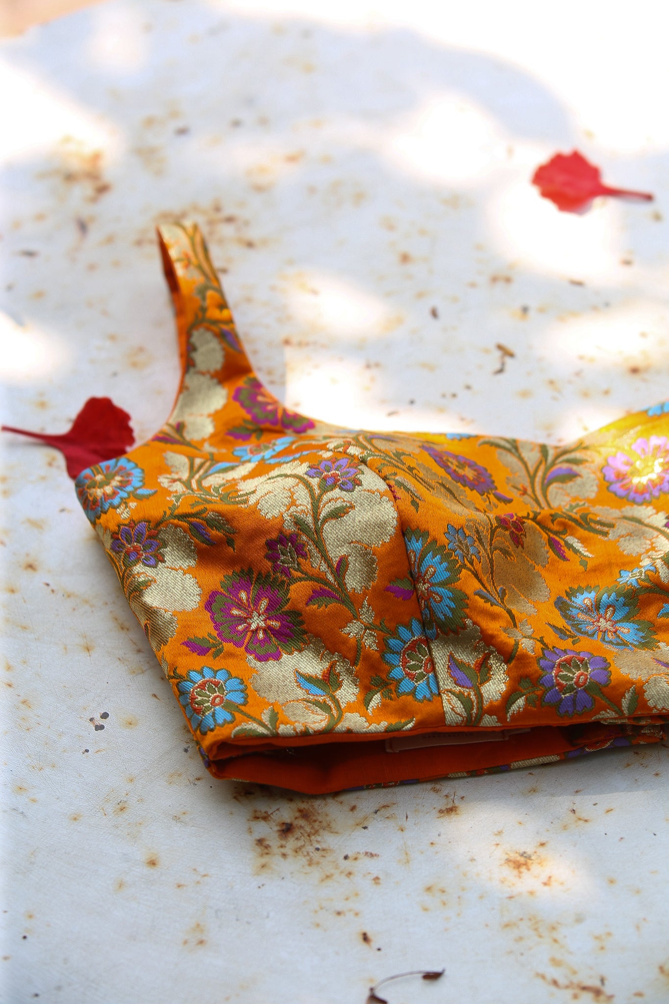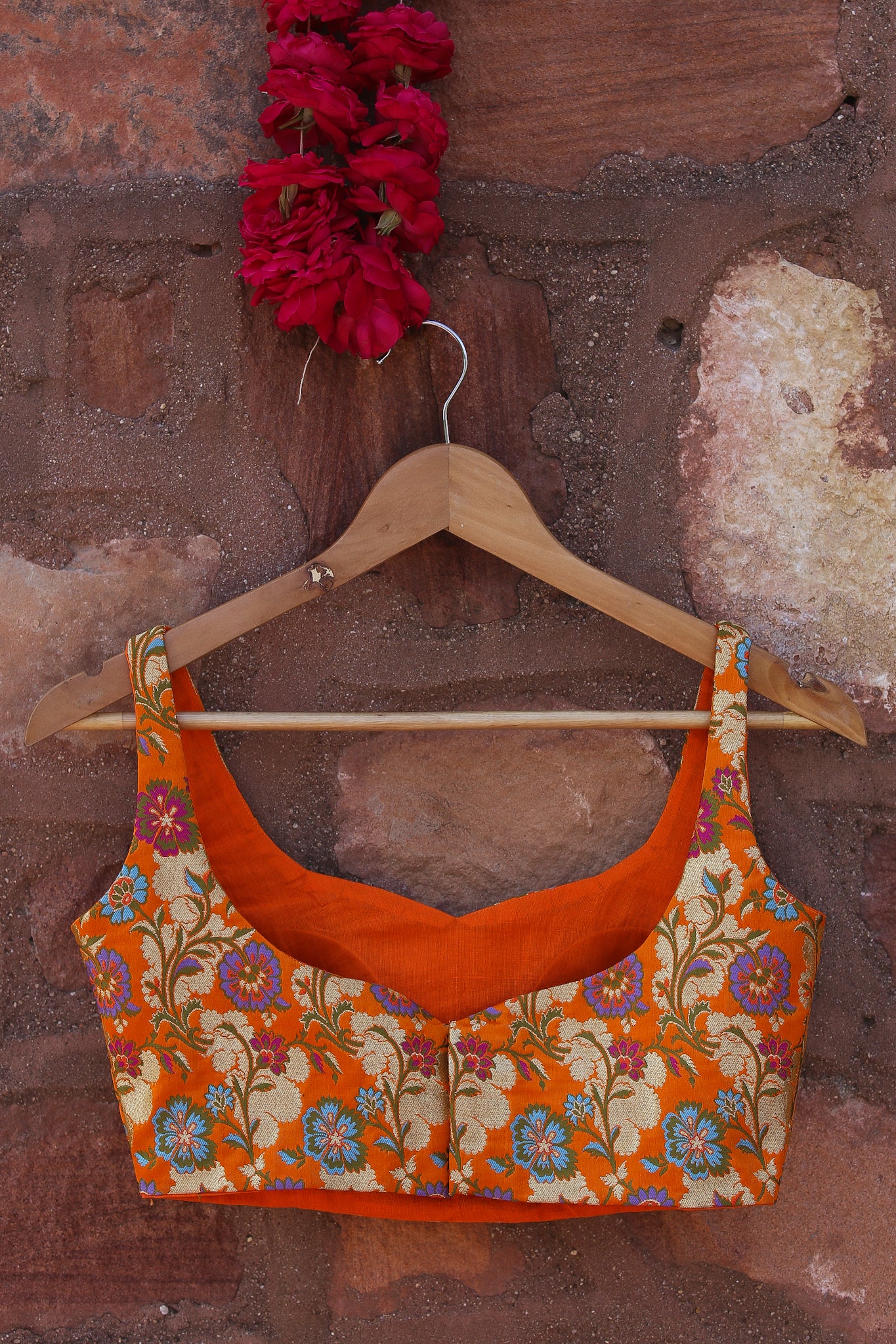 Crafted from pure Banarasi satin silk fabric, this Bright Orange Colored sleeveless blouse blends traditional luxury with everyday comfort. It comes with padded cups, a back hook closure, and dual lining layers, including a soft pure cotton inner lining that keeps it comfortable and breathable all day long.