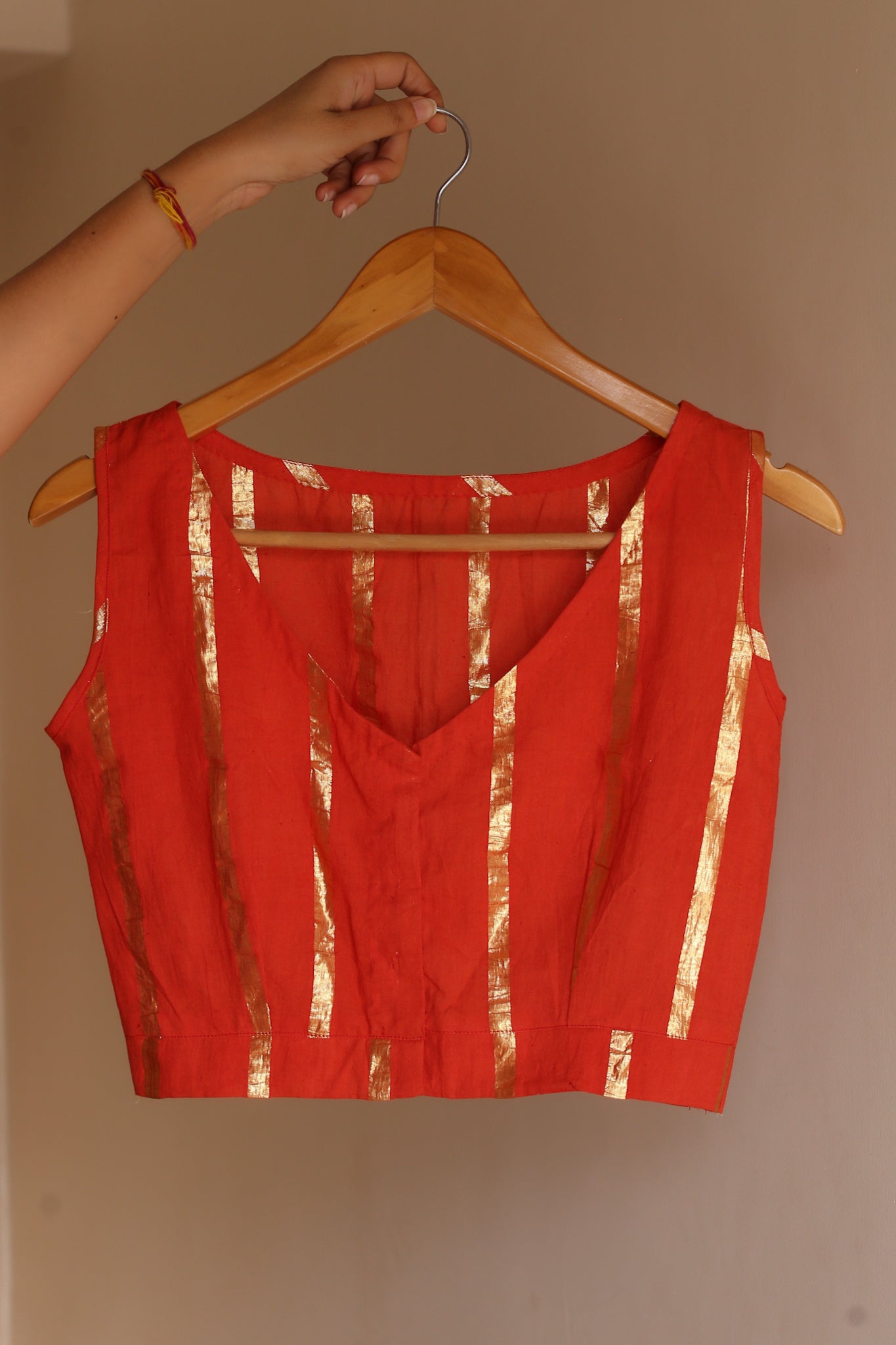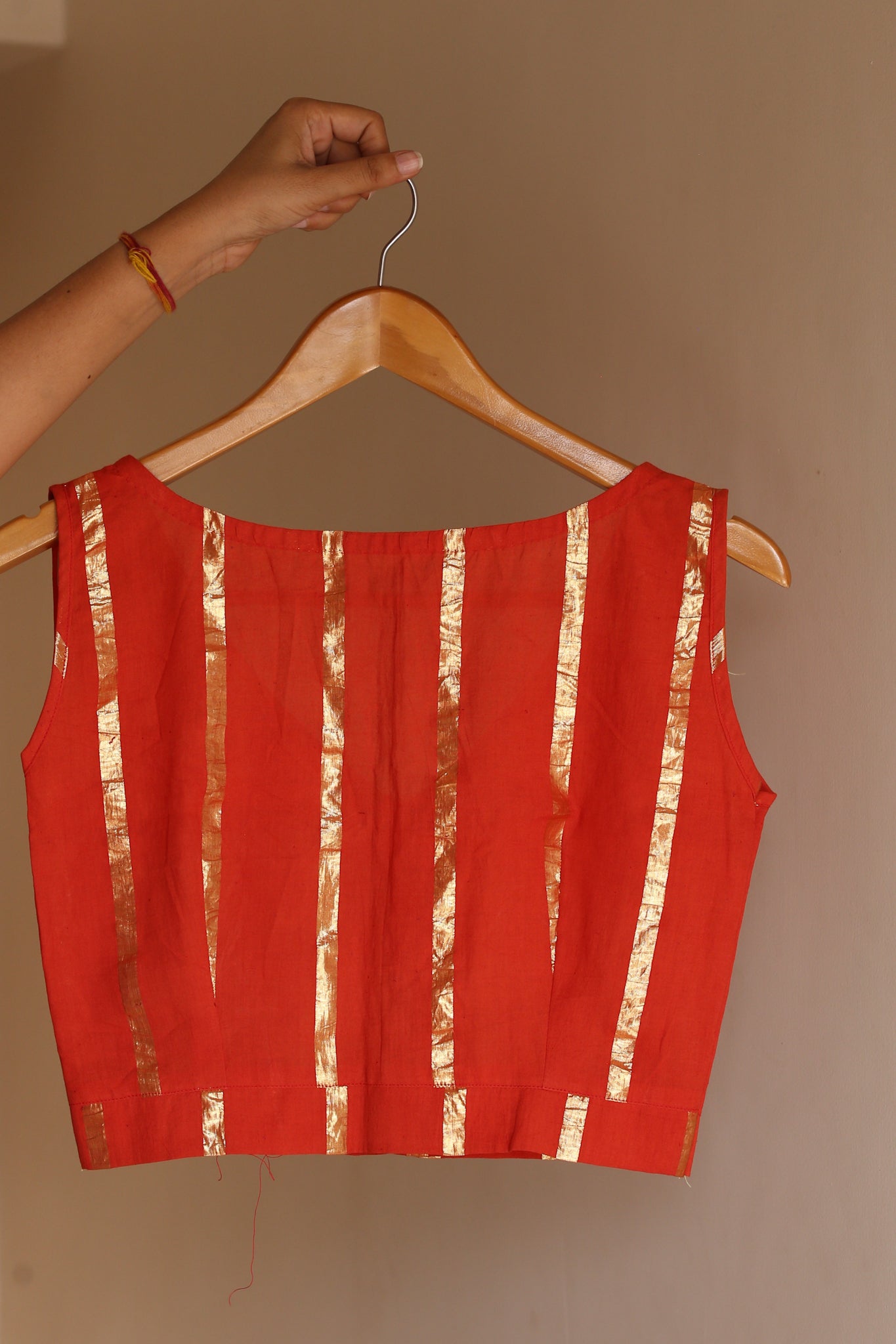Red Cotton Sleeveless Blouse with Zari Lines