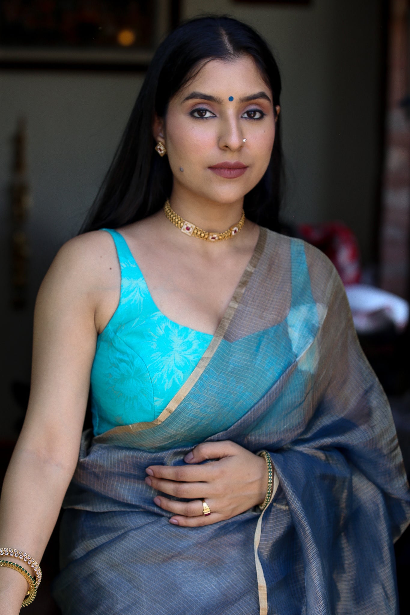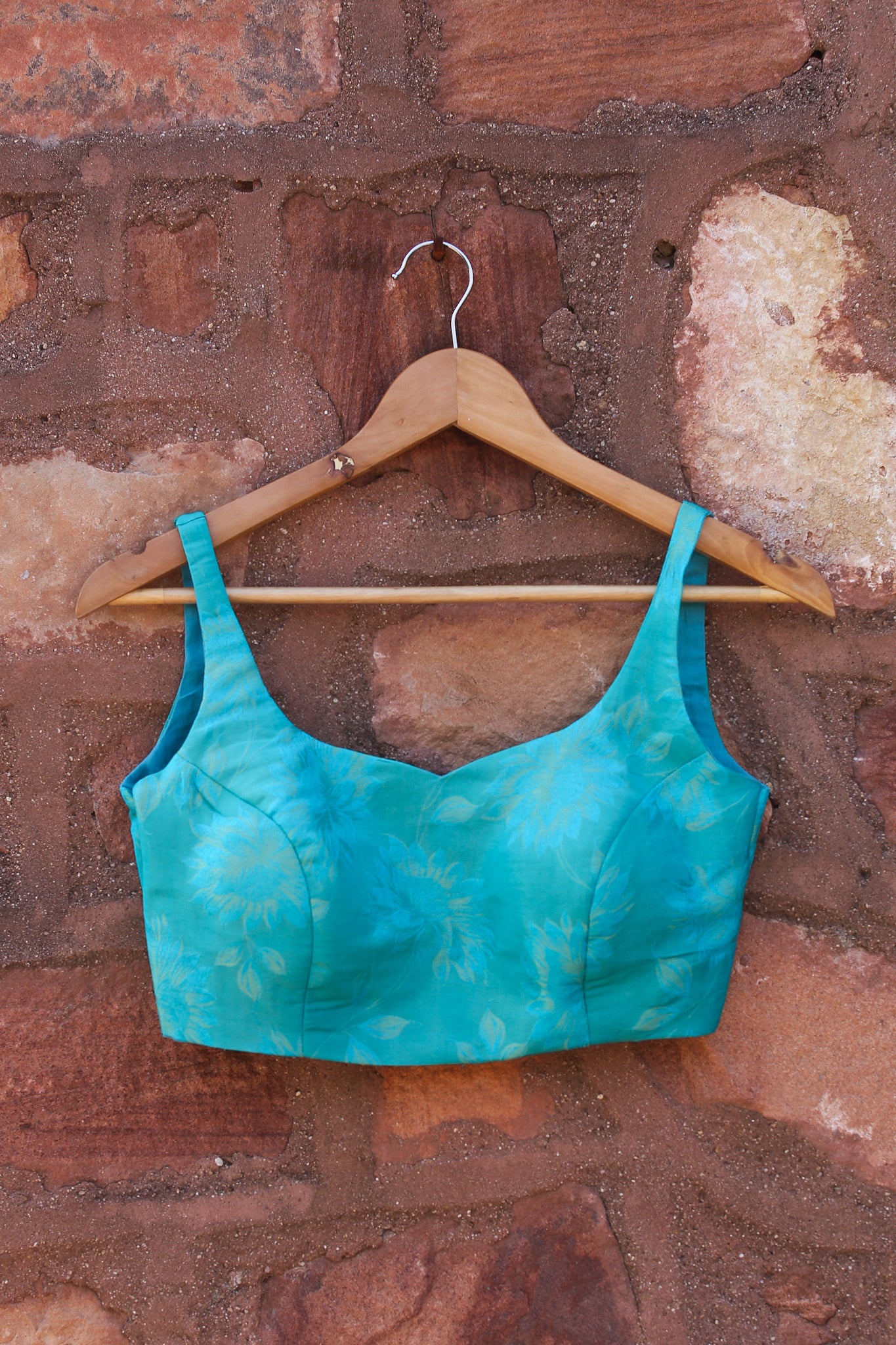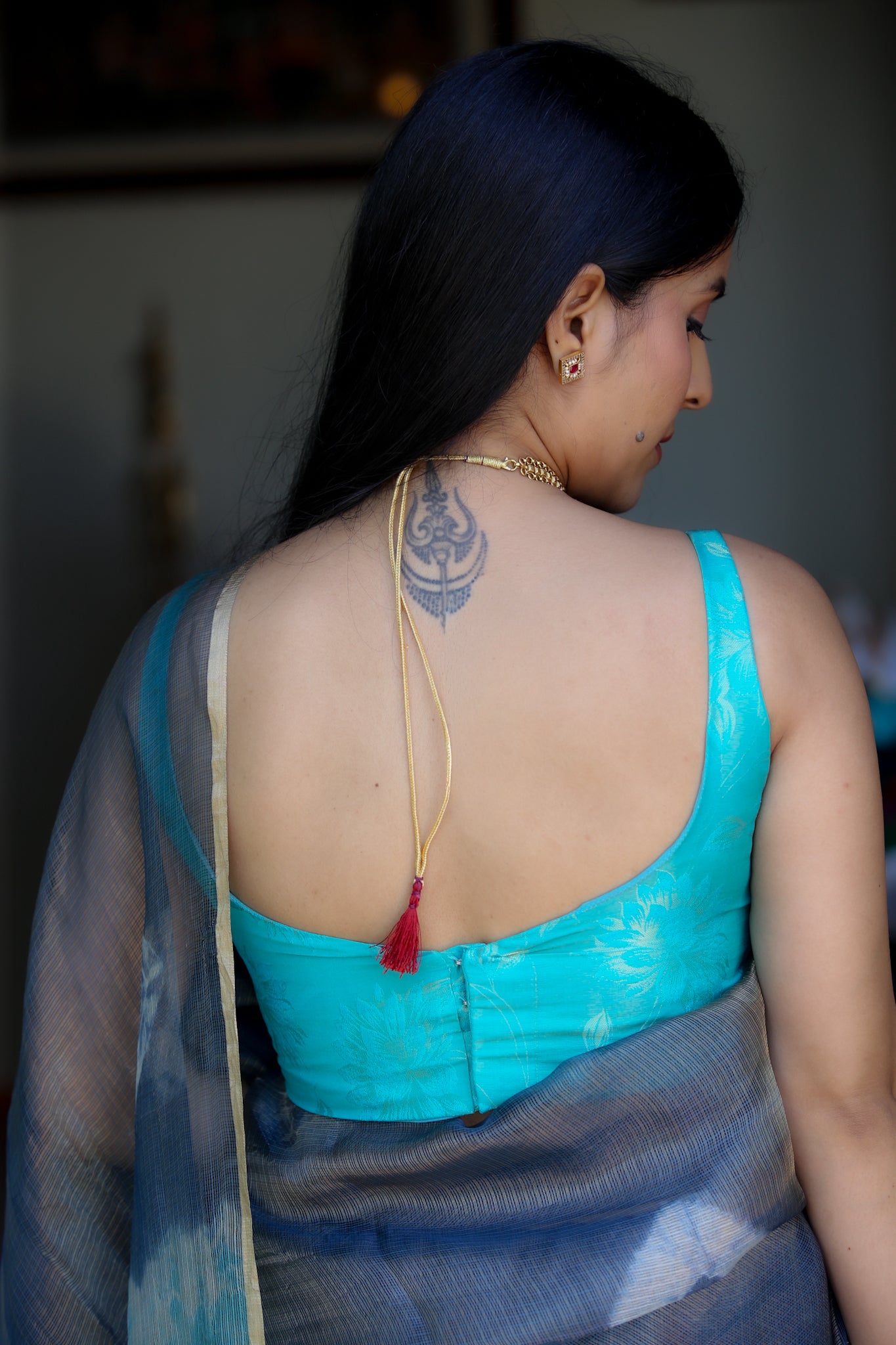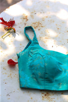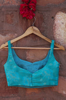 Crafted from pure Banarasi silk handloom fabric, this Blue Colored sleeveless blouse blends traditional luxury with everyday comfort. It comes with padded cups, a back hook closure, and dual lining layers, including a soft pure cotton inner lining that keeps it comfortable and breathable all day long.