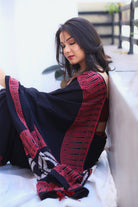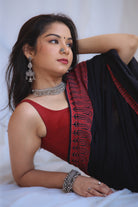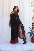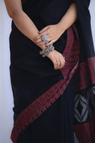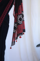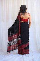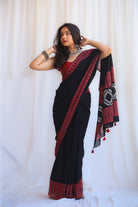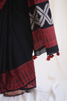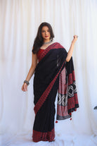 This black cotton saree showcases the timeless elegance of ambi (paisley) borders in discharge print using madder tones, blending tradition with visual richness. Accented with handmade tassels and accompanied by a blouse piece, it’s a classic for festive and formal wear.