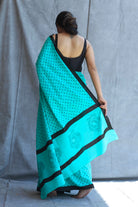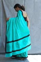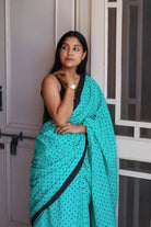 This exquisite "Basant" saree boasts intricate handcrafted designs, dyed using azo-free dyes for a luxurious and sustainable touch. The smart Polka print is adorned with a green body black polka block print, making a statement of elegance and sophistication. Complimentary to the saree is a matching block print blouse, completing this high-end and exclusive ensemble.