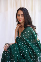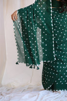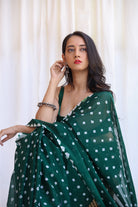 Bottle Green Cotton Saree with White Hand-Tied Bandhani Pattern