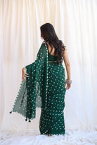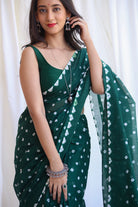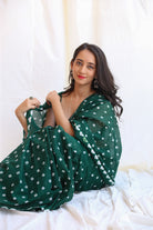 The deep bottle green shade of this saree is beautifully complemented by white Bandhani detailing, adding a touch of tradition. A versatile piece, ideal for both daytime charm and evening grace.