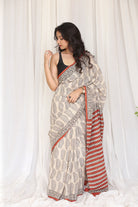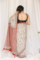 A timeless ambi motif in bold black flows gracefully over soft ivory cotton in this Bagru handblock saree. The madder and black border creates an elegant contrast, steeped in heritage. Lightweight and detailed with handmade tassels, it’s a classic wrapped in quiet poetry.