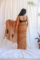 This rich brown saree features a bold handblock geometric design accented with polka-lined black motifs, creating a striking visual contrast. Made from soft pure cotton and adorned with handmade tassels on the pallu, it's a beautiful blend of contemporary structure and traditional art.