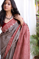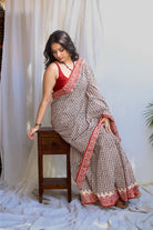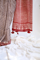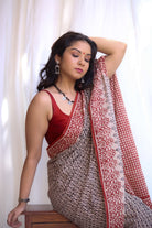 Sanghya is a timeless Bagru handblock-printed saree, dyed naturally. The rich madder red border adds a striking contrast, enhancing its elegance. A perfect blend of heritage and grace, ideal for cultural and formal occasions.