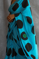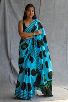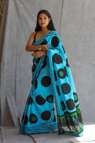 Elevate your style with this exquisite saree, featuring intricate handcrafted designs and dyed with premium azo-free dyes. The striking geometric print, in a beautiful blend of sky blue, green, and black polka, is complemented by a matching block print blouse.