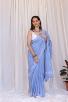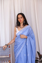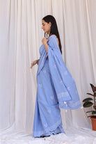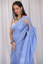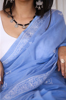 This serene light blue cotton saree showcases delicate bird motifs through discharge handblock printing, evoking a sense of calm and freedom. Subtle and graceful, the saree is finished with handcrafted tassels that complete its airy, nature-inspired aesthetic.
