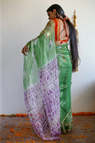 Soft green Bandhani, a dusky purple pallu, and shimmering fabric, this saree evokes twilight in bloom. Crafted from handloom Kota Doria silk by tissue silk, it offers a breathable texture with elegant glow. Ideal for evening events, and finished with zari border, tassels, and a matching purple blouse.