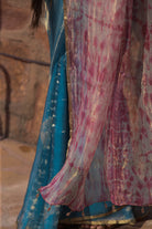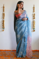 A fluid blend of blue Bandhani and blooming pink Shibori, this saree is woven in handloom Kota Doria silk by tissue silk, offering a soft shimmer and feather-light drape. Subtle gold tones play with light, making it a perfect pick for daytime elegance. Includes pink blouse, zari border, and tassels.