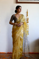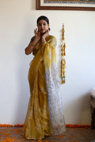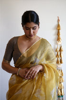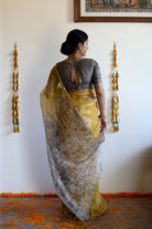 This luminous yellow Bandhani saree is crafted from handloom Kota Doria silk with tissue silk, creating a sheer, glowing drape. The fabric is light yet structured, with a subtle golden undertone that shifts beautifully with movement. The contrasting grey Shibori pallu adds smoky elegance, like sunlight veiled in mist. Finished with zari borders, handmade tassels, and a matching grey blouse.