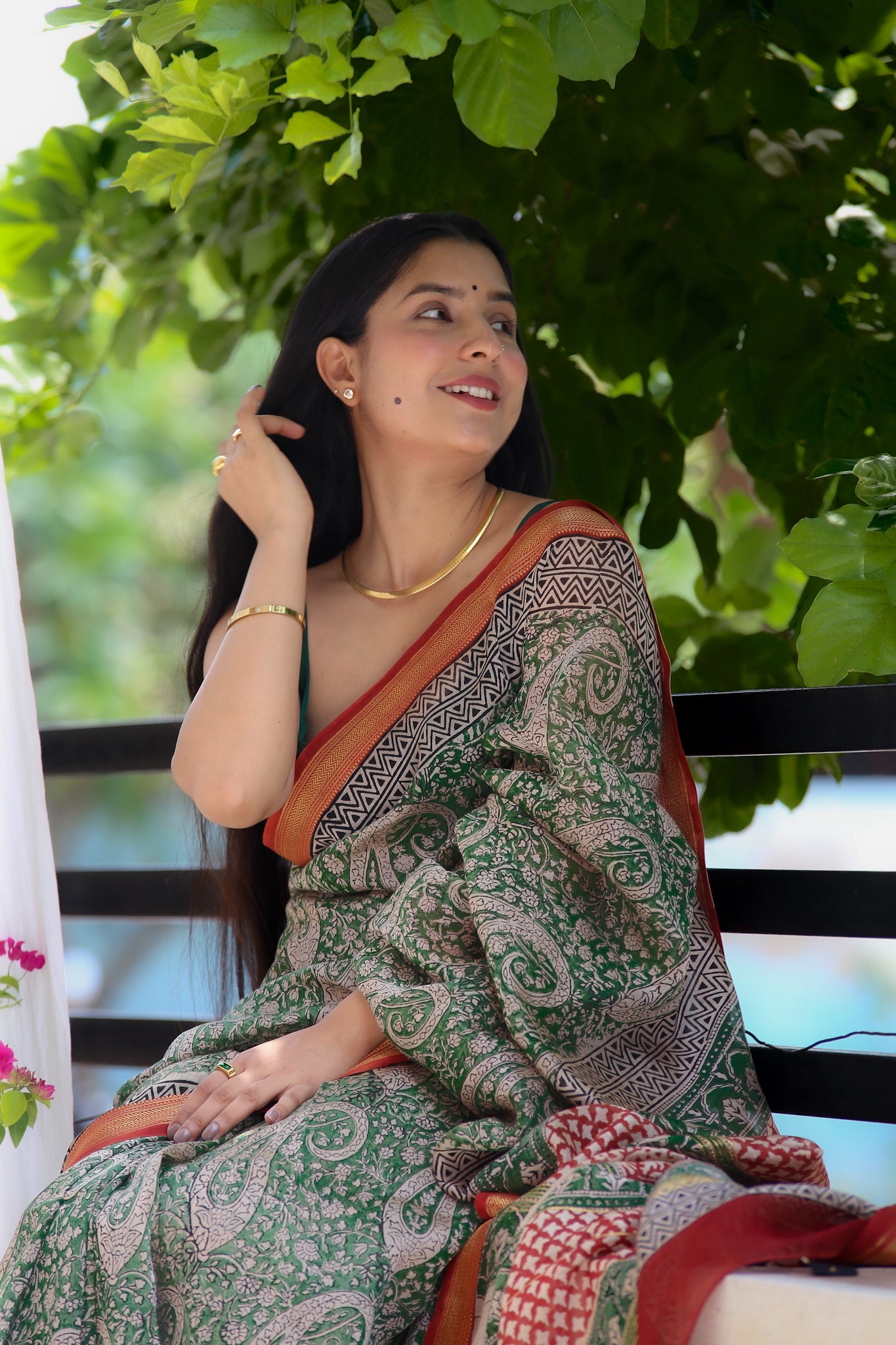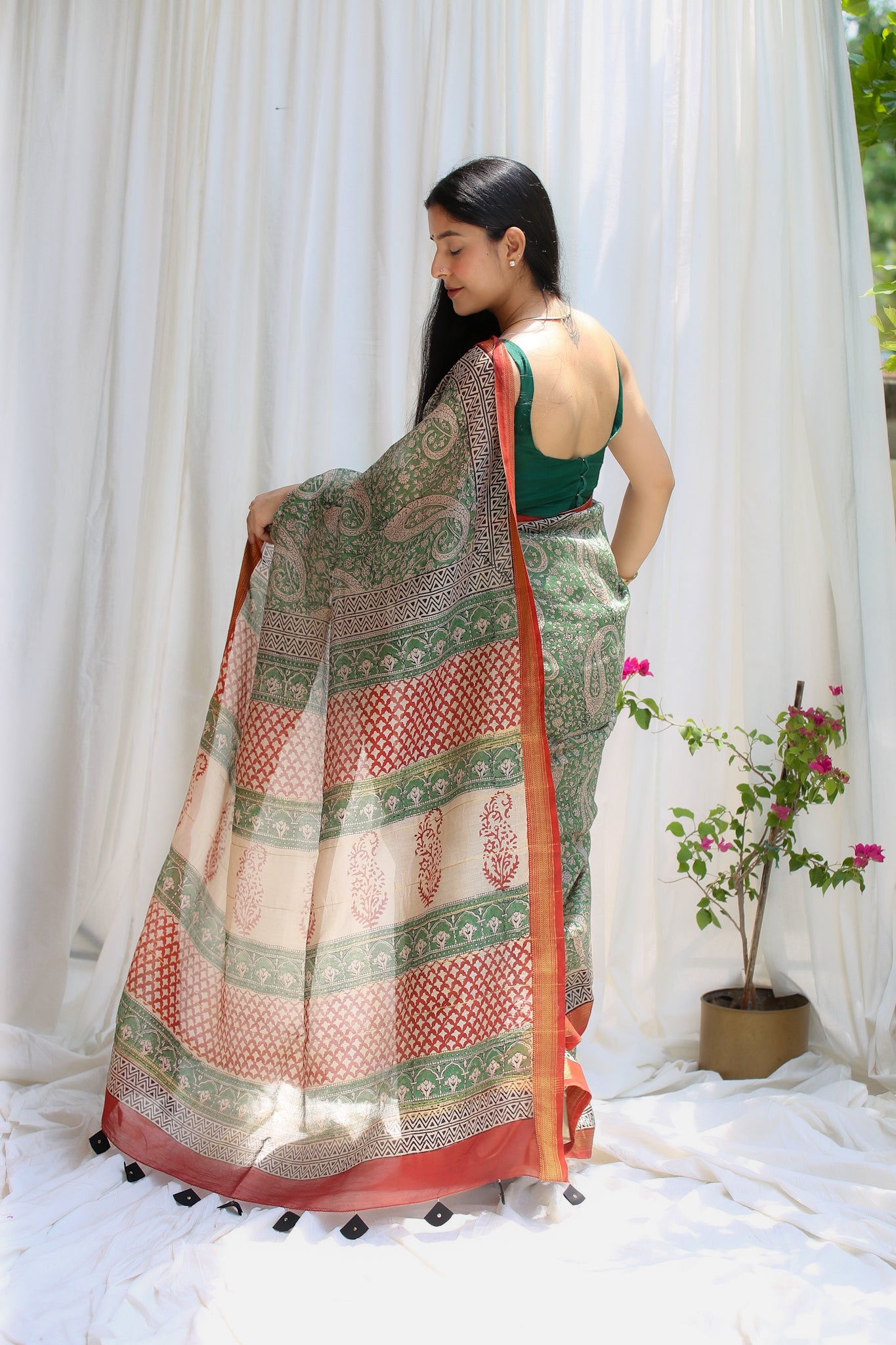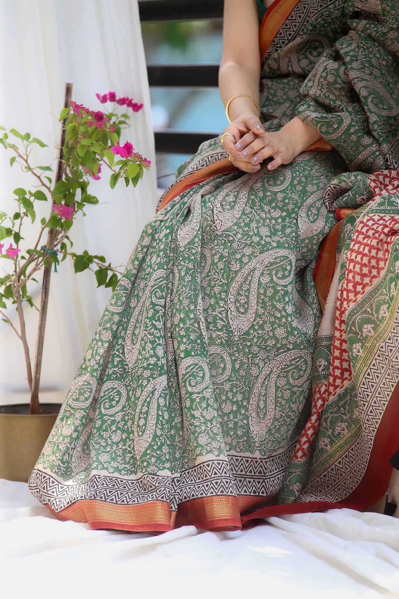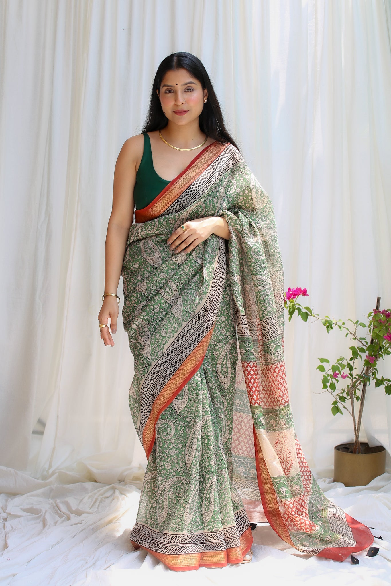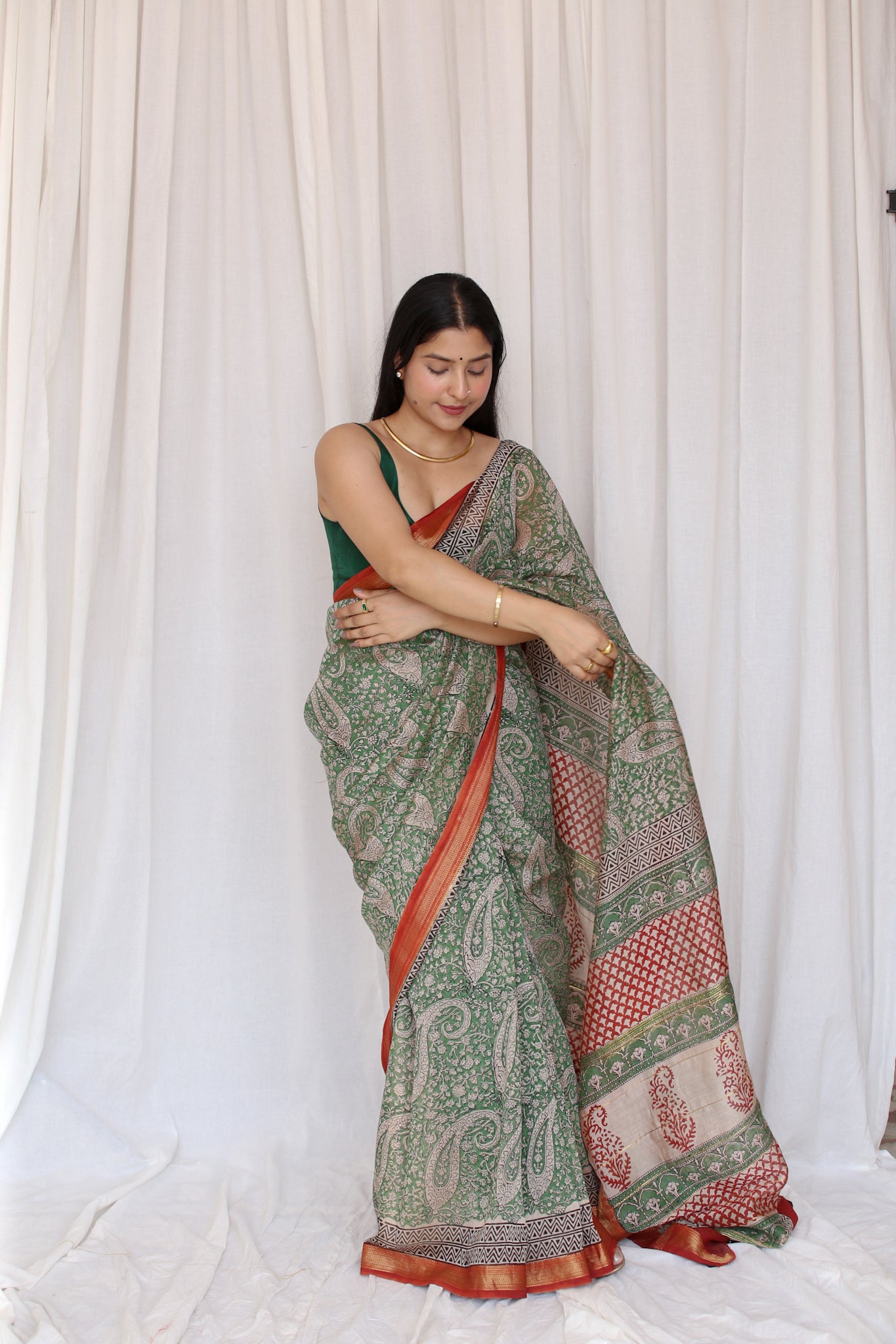 Tanvi : Moss Green Maheshwari Saree with Red Border (Bagru Handblock)