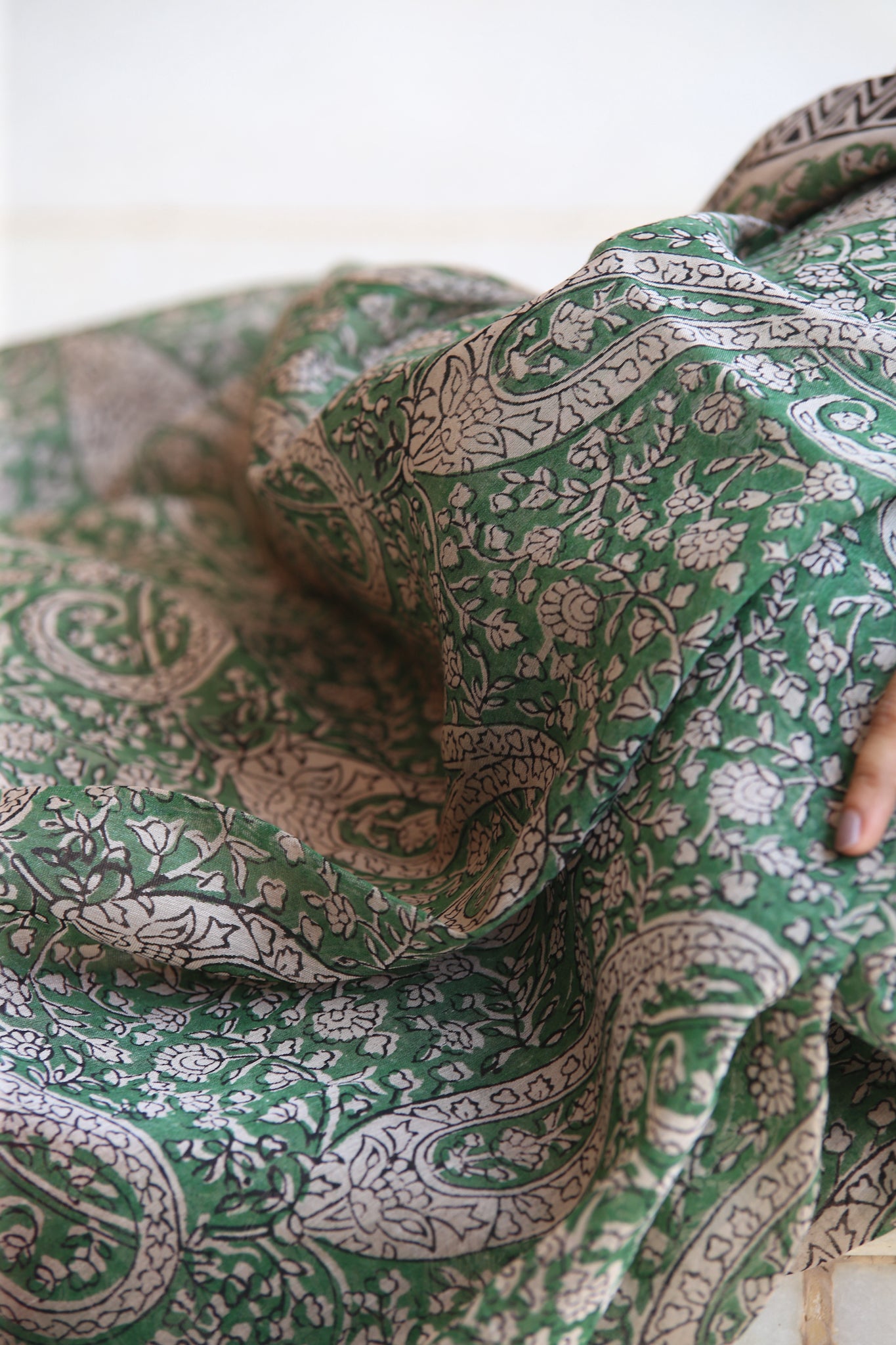 Tanvi, symbolizing "delicate beauty," is the essence of this moss-green Maheshwari saree. Featuring an intricate jal (all-over) Bagru handblock print and a classic red border, this drape blends tradition with contemporary charm. Light yet regal, it makes for an exquisite choice for celebrations and everyday elegance.