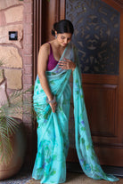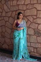 A refreshing aqua hue saree adorned with intricate handpainted florals, perfect for a breezy and elegant look.