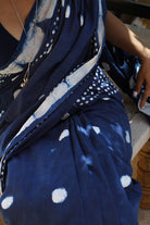 This saree features a unique polka dot handcrafted design and a modern, bold aesthetic. The indigo dye gives it a heritage look, but be careful when washing as it may bleed. Additionally, the soft, hand-dyed fabric and handmade tassels add an authentic and contemorary touch to the overall look. The blouse, also hand-dyed in the same block print, perfectly matches the saree. Washing with mild liquid detergent is recommended to preserve the richness of the natural dyes and intricate prints.