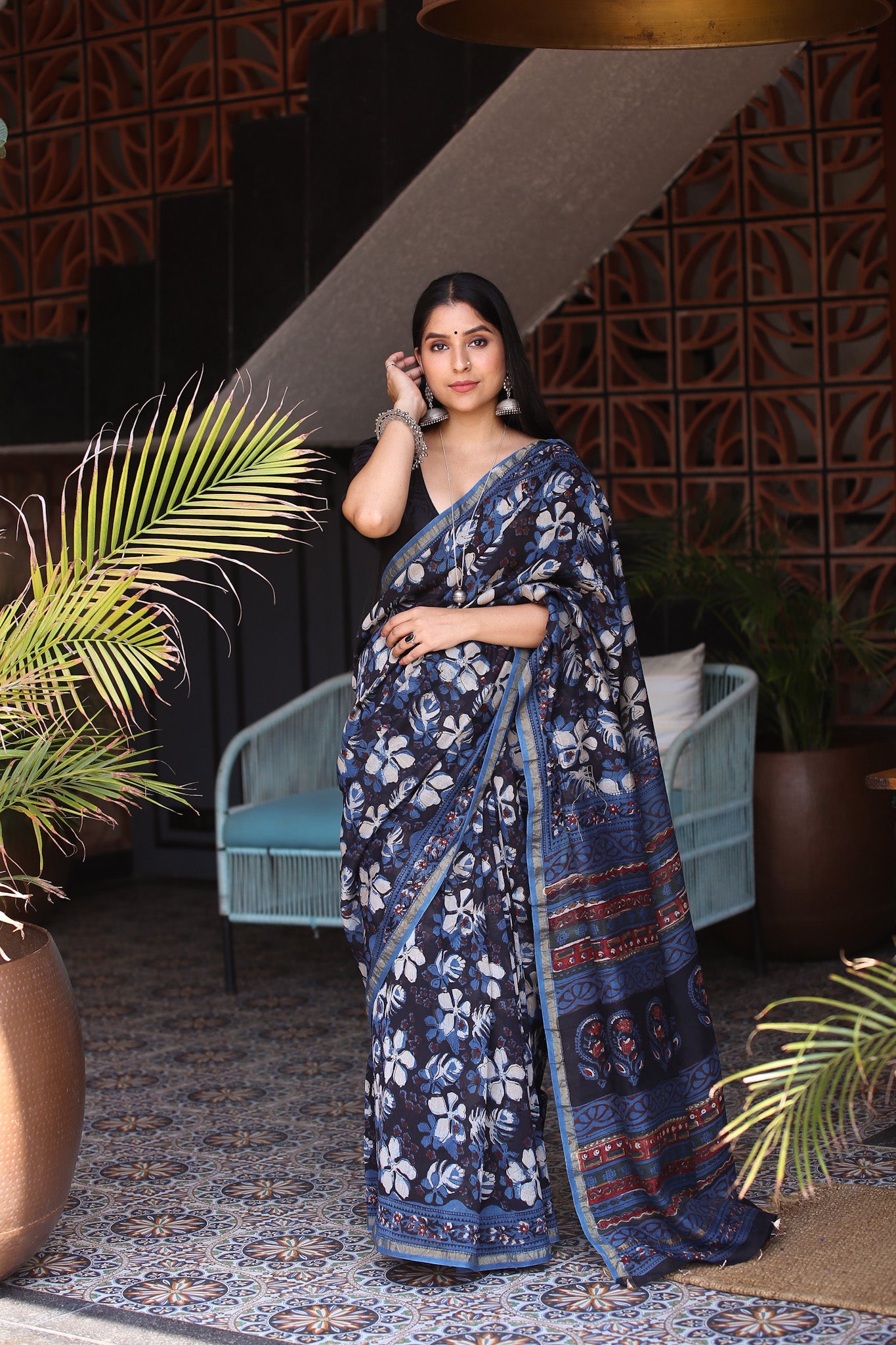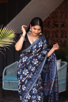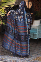 The Black Indigo Handblock Chanderi Silk Cotton Saree showcases intricate jahota prints on a rich black backdrop. With a blend of soft silk cotton, this saree exudes a timeless elegance, suitable for various occasions.