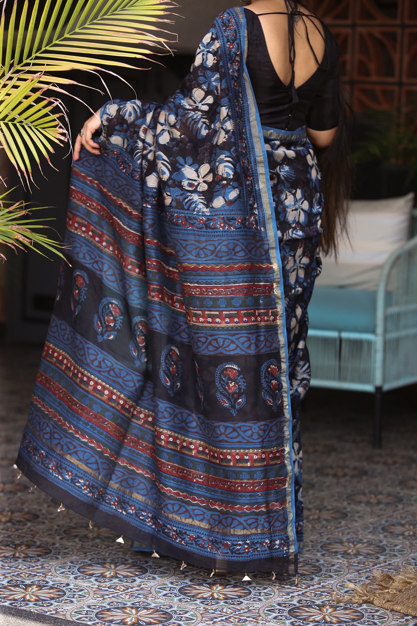 Other Details : Silk by Cotton, 5.5m length, 45'' width, 80-90 cm Blouse length, Hand Block Print process, Handmade Tassels on pallu.