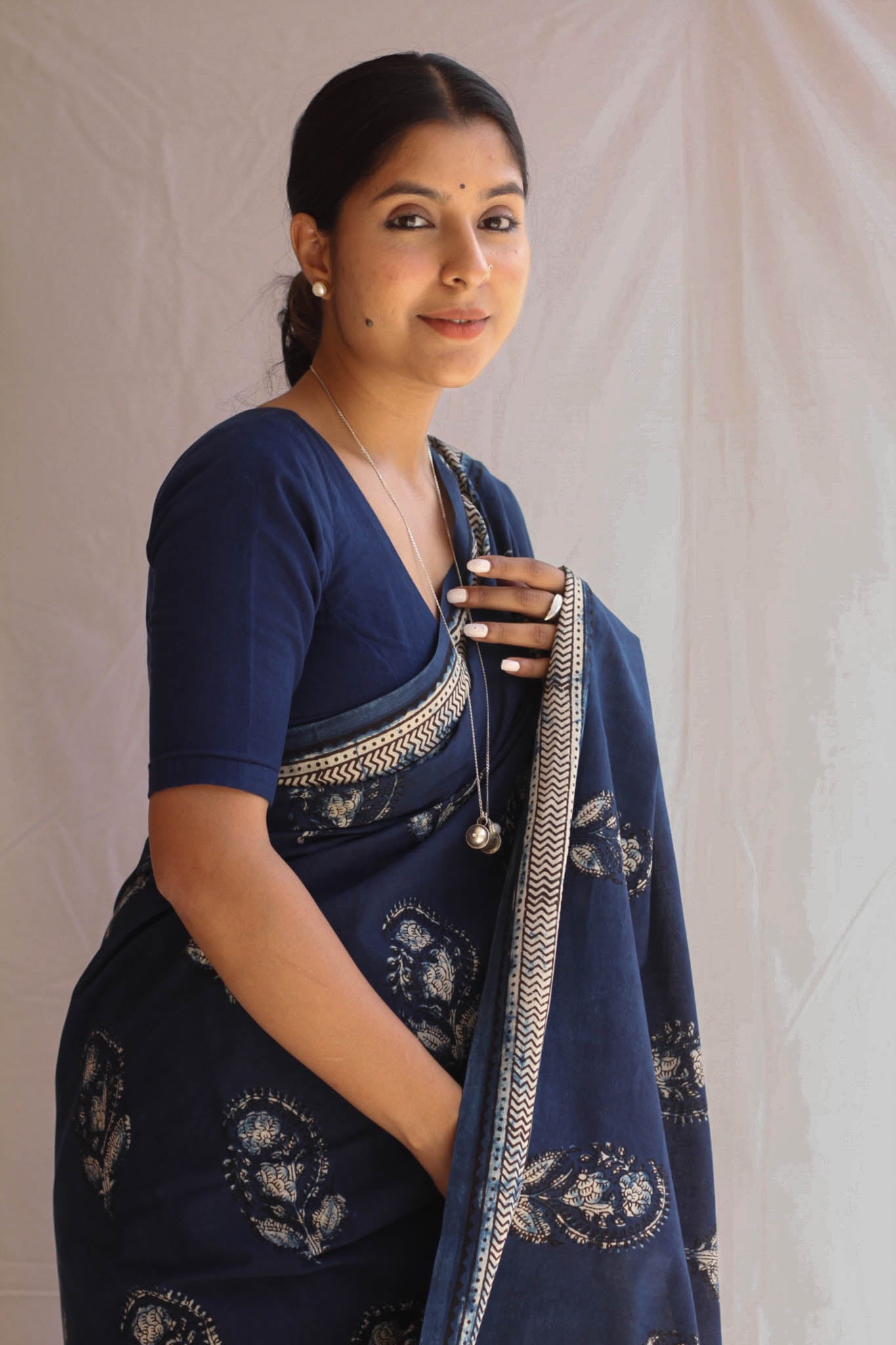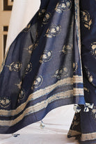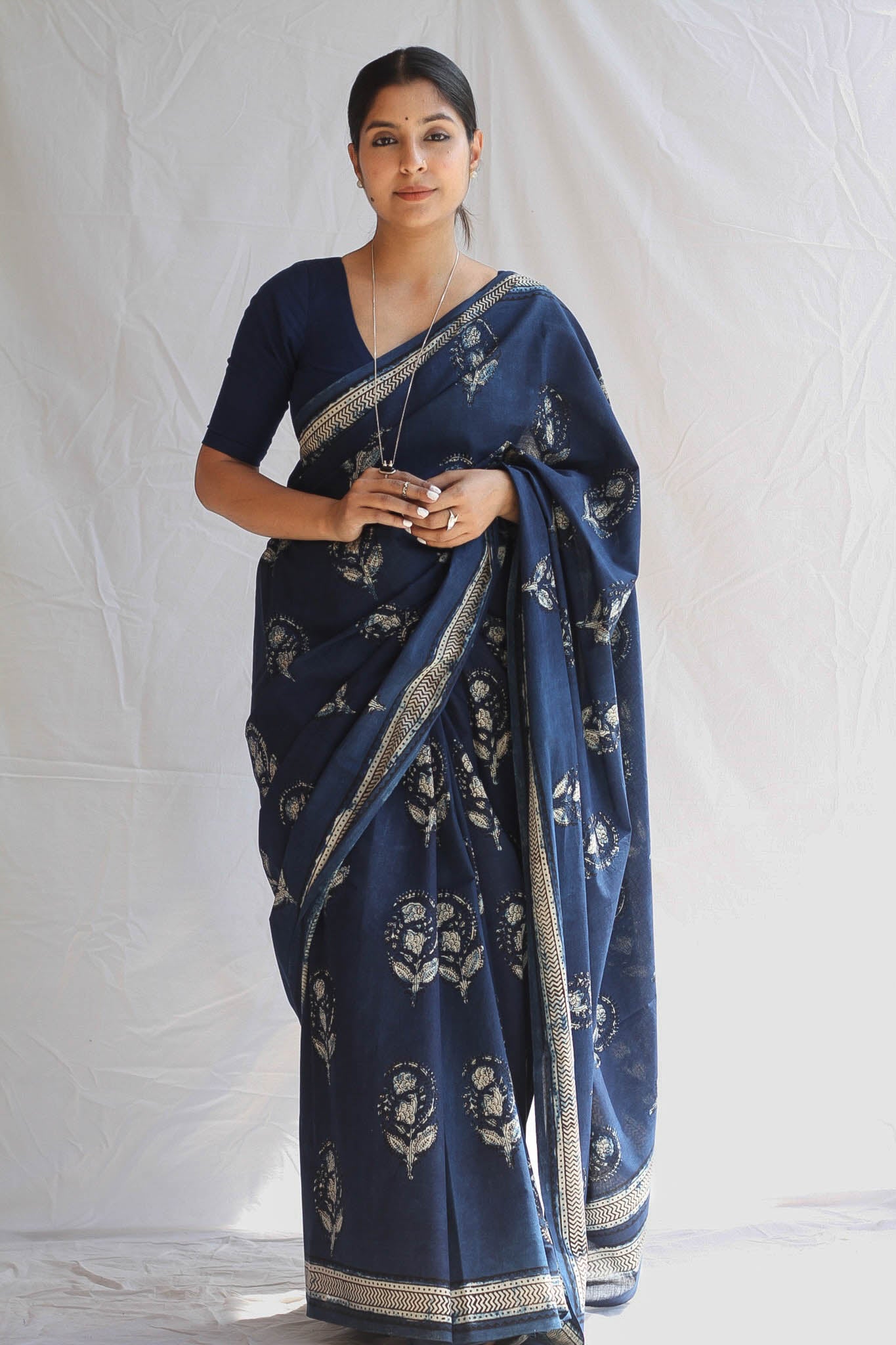 Indulge in timeless heritage with Chithiyaan Indigo Jahota block print saree. Handcrafted for an authentic look, the cotton fabric is naturally dyed and is very soft. With a matching block print blouse, this saree exudes contemporary luxury and elegance. Perfect for any formal occasion.