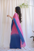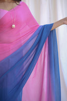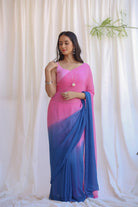 This exquisite pink and indigo ombre viscose georgette saree showcases a stunning fusion of warm pinks merging into deep indigo hues. The luxurious, soft viscose georgette fabric ensures a fluid, comfortable fit, allowing the saree to move beautifully with every step.