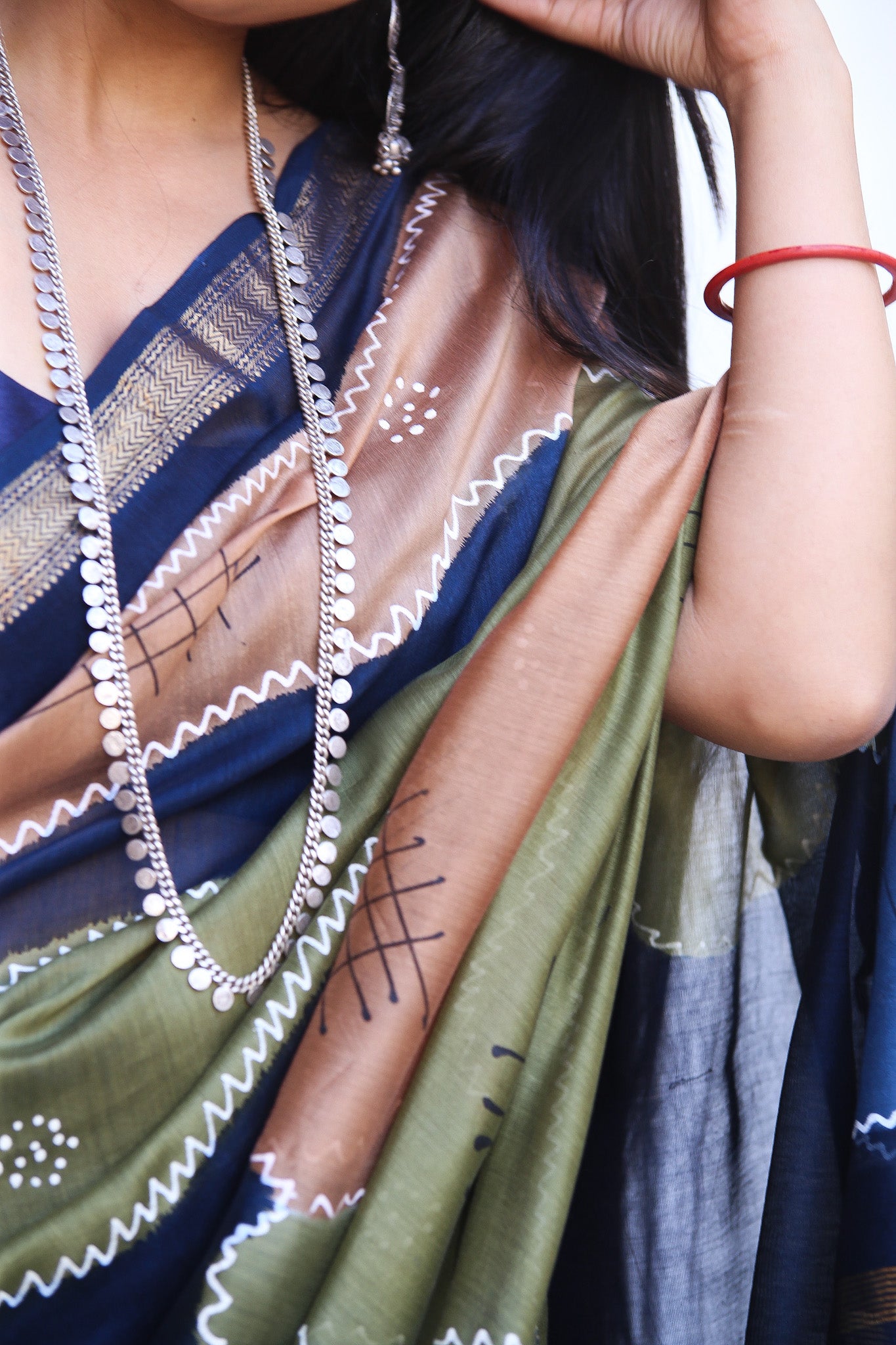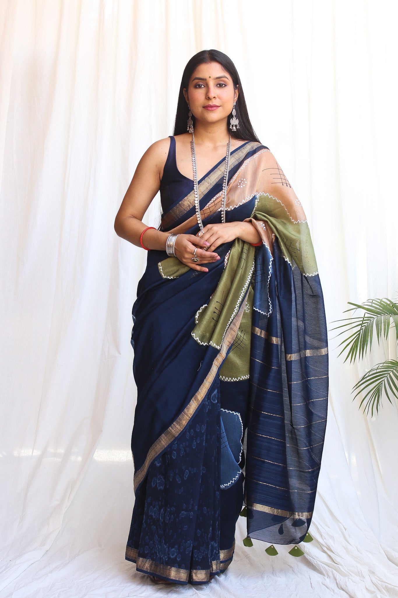 Exuding artistic finesse, this indigo saree showcases a stunning interplay of brown and green hues in modern handpainted designs. The fluid silk cotton fabric, combined with intricate motifs, makes it a timeless piece for both contemporary and traditional styling.