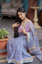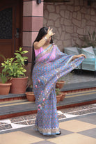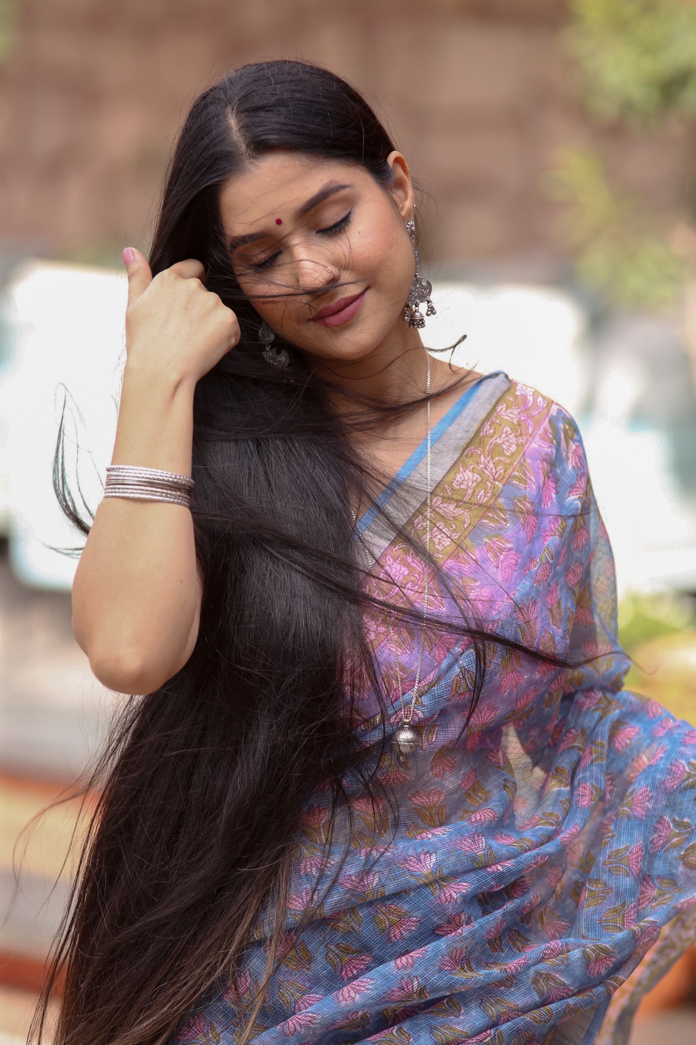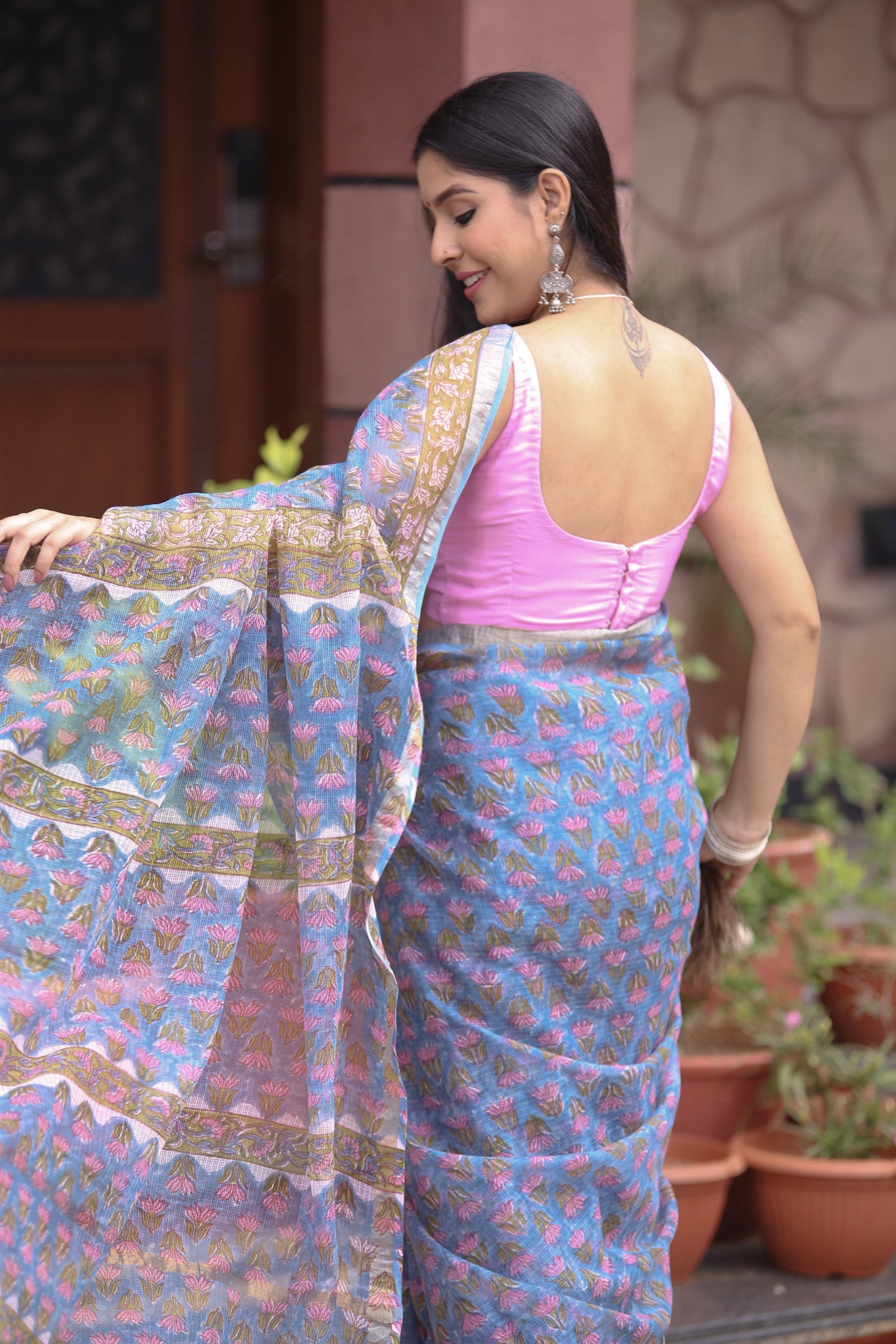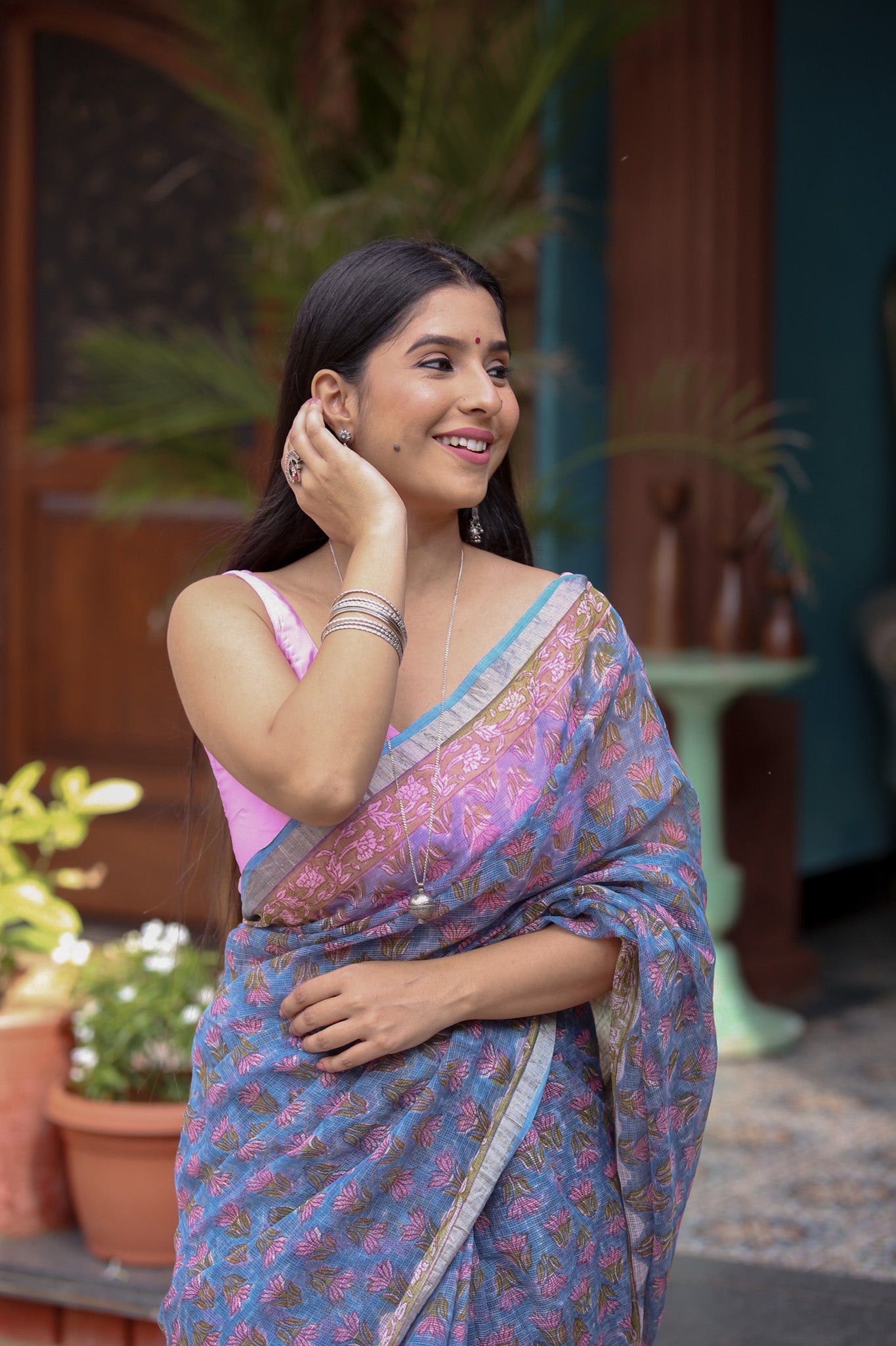 Experience the airy elegance of this Blue Kota Doria Saree, featuring exquisite handblock Sanganeri prints. The soft, sheer fabric is adorned with a shimmering zari border, adding a touch of subtle glamour. Finished with delicate pink tassels at the pallu, this saree effortlessly combines traditional craftsmanship with a modern, chic look, perfect for day-to-night wear.