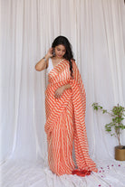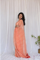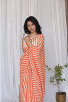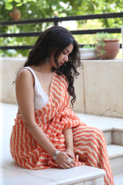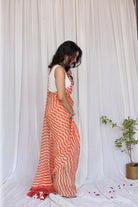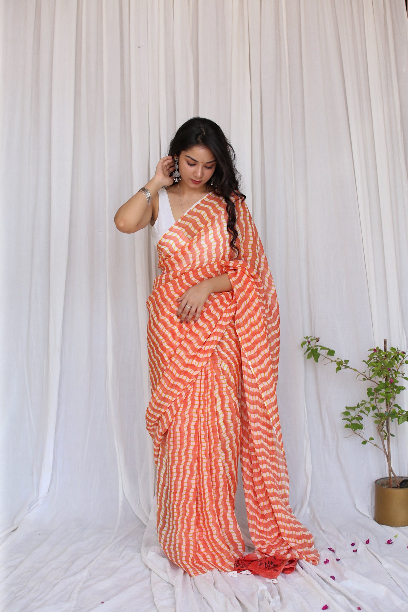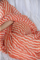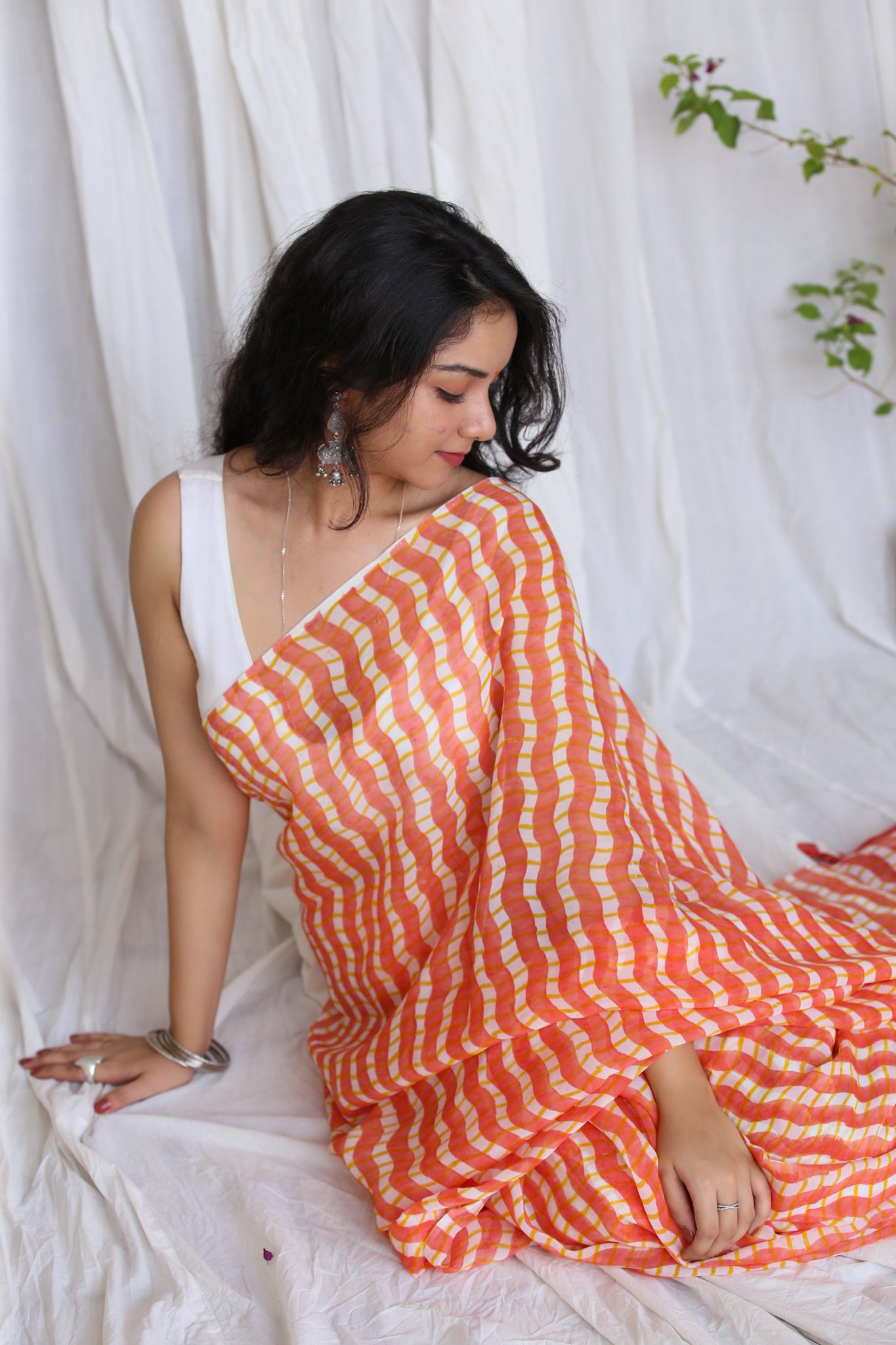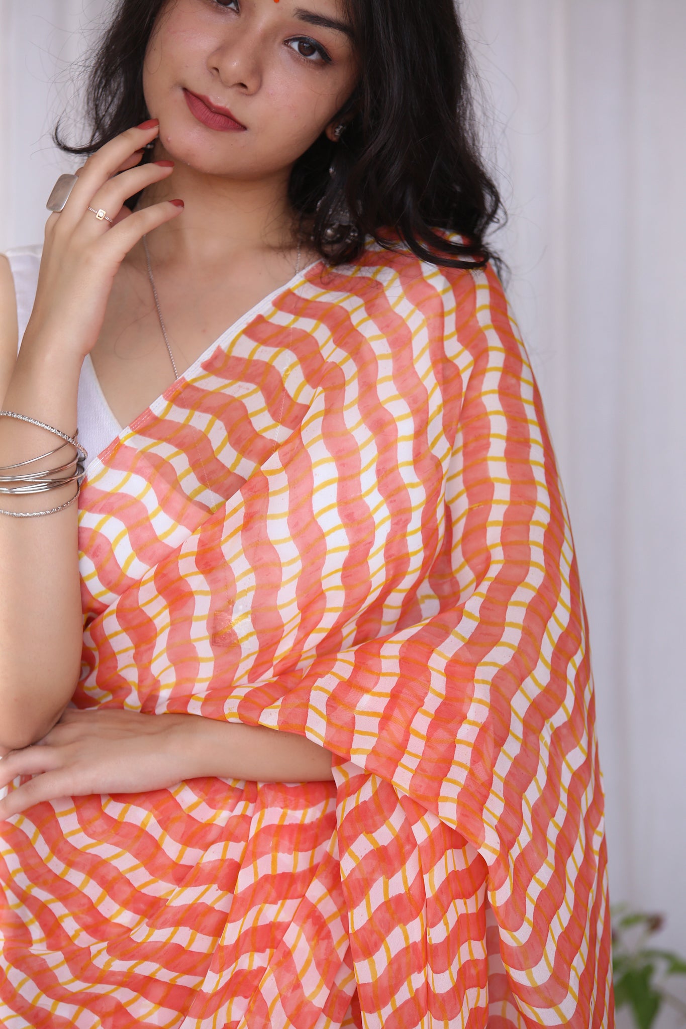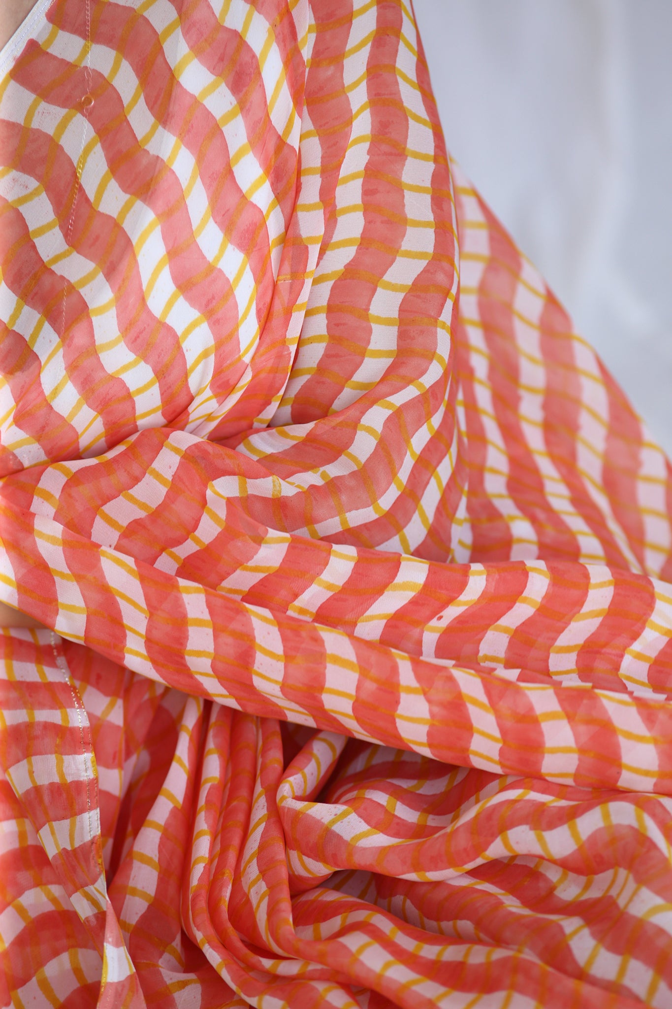 River of Light : Peach Yellow Striped & Wave Handblock Organza Saree