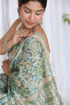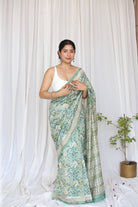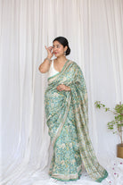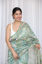 A serene Mint-colored Sanganeri Handblock Print Saree, designed with a subtle zari border for a refined look. Made from Chanderi Silk Cotton, it is lightweight yet elegant. The tasseled pallu completes its graceful silhouette.